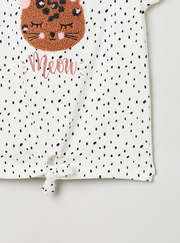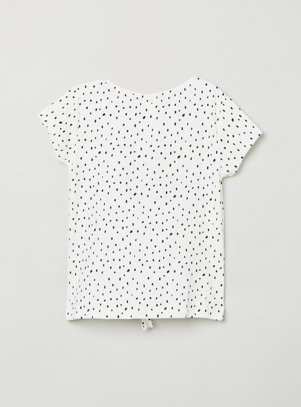 Amp up your child's wardrobe with this trendy printed T-shirt which has a round neck, tie-up at the hem and short sleeves.