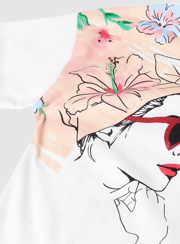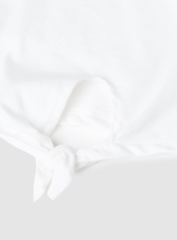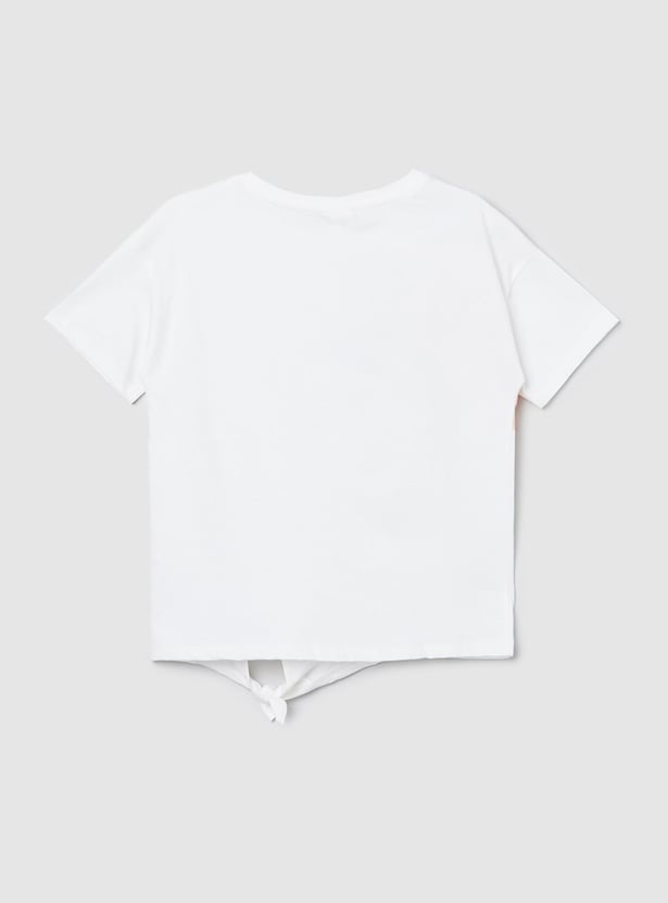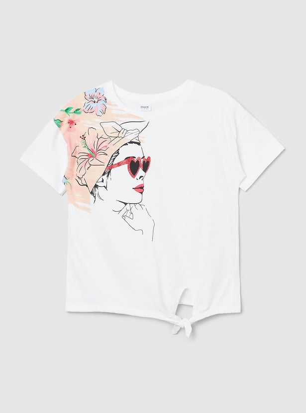 An ideal pick for a casual wardrobe, this trendy t-shirt is designed with bold prints, short sleeves, tie-up hem, and a round neckline.