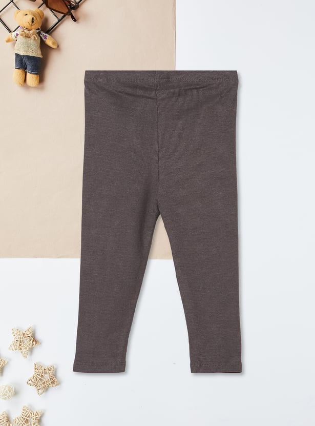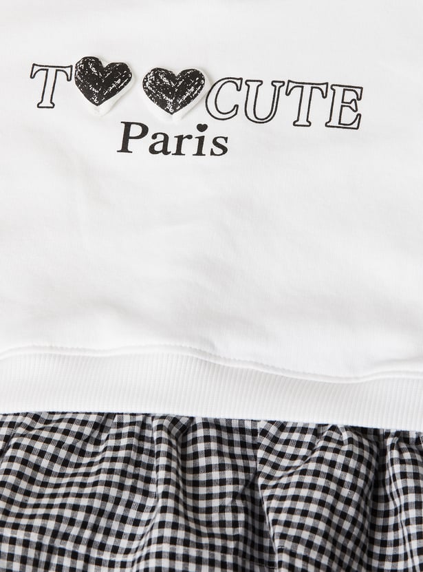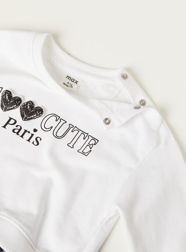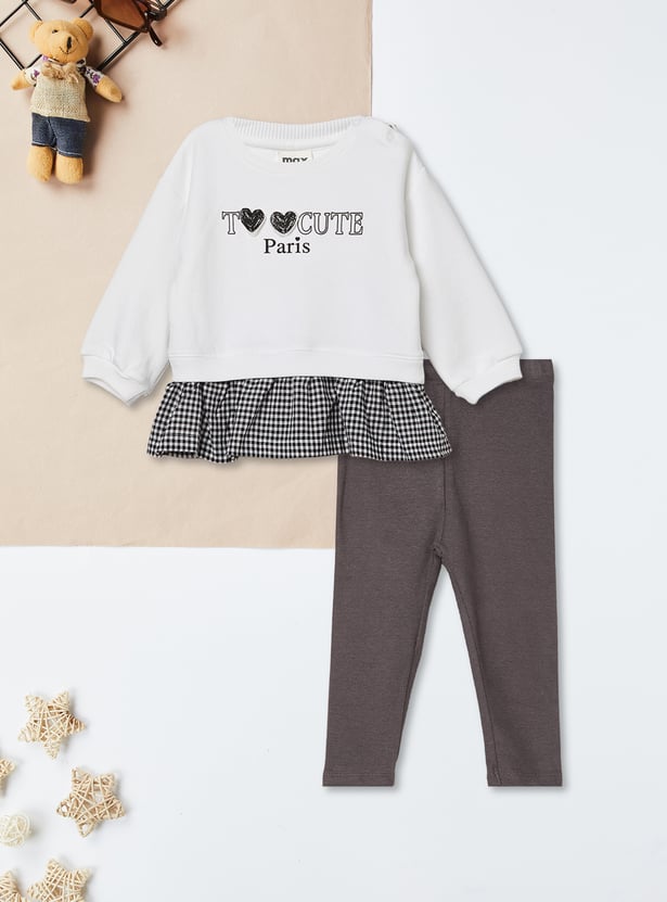Cosy meets cute in this charming set, featuring a printed sweatshirt with a classic round neck, full sleeves, and ribbed hems for snug comfort. The frill detail adds a playful twist, while the matching leggings with an elasticated waist ensure easy movement and all-day wear.