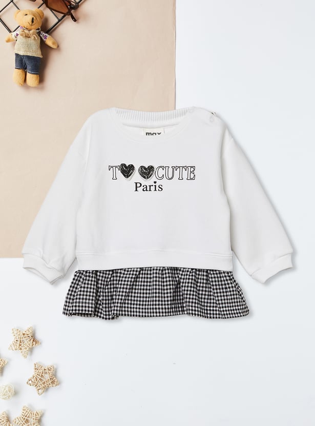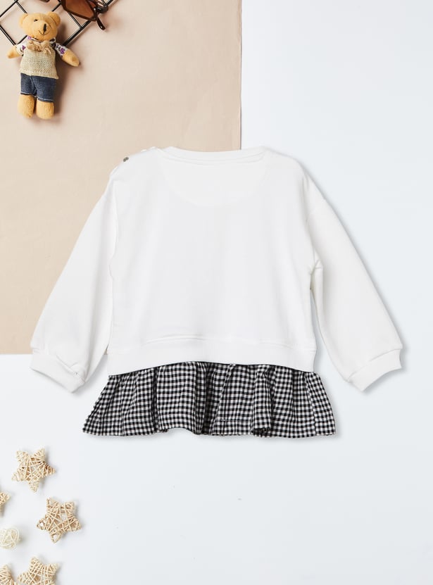 Cosy meets cute in this charming set, featuring a printed sweatshirt with a classic round neck, full sleeves, and ribbed hems for snug comfort. The frill detail adds a playful twist, while the matching leggings with an elasticated waist ensure easy movement and all-day wear.
