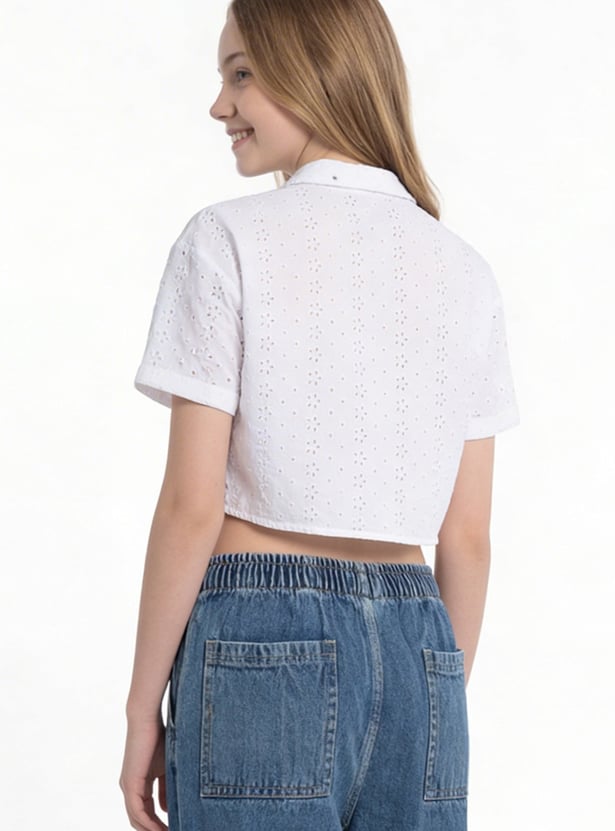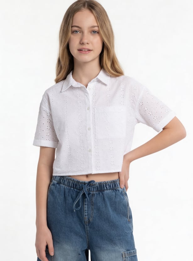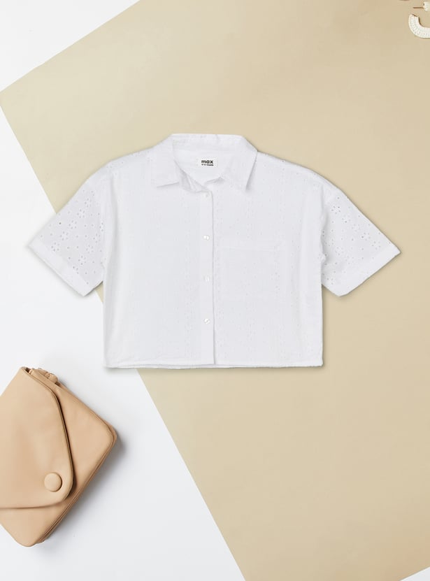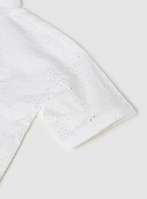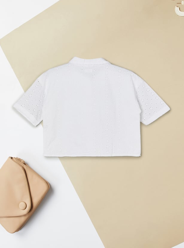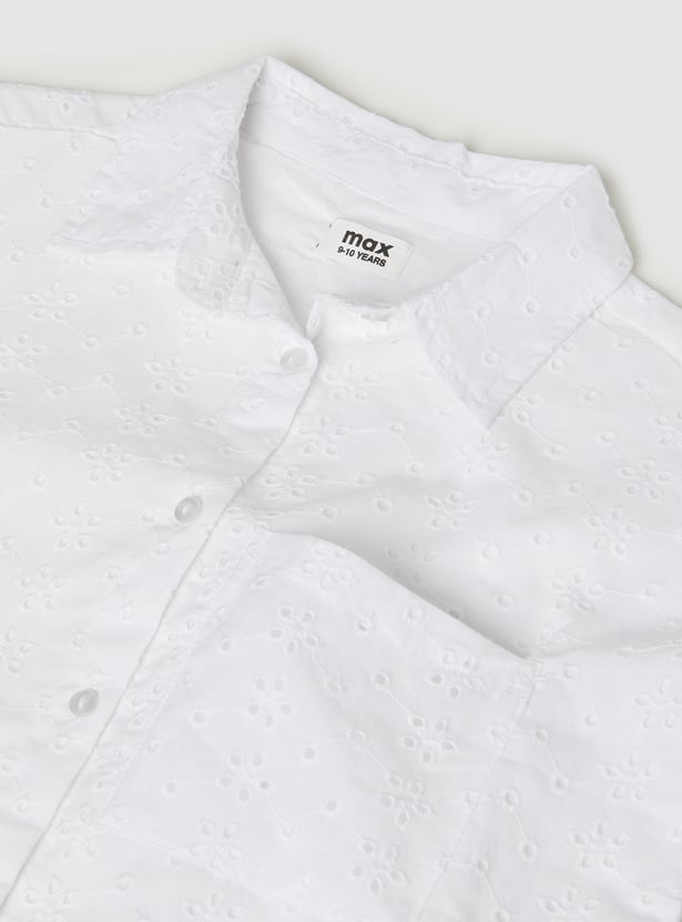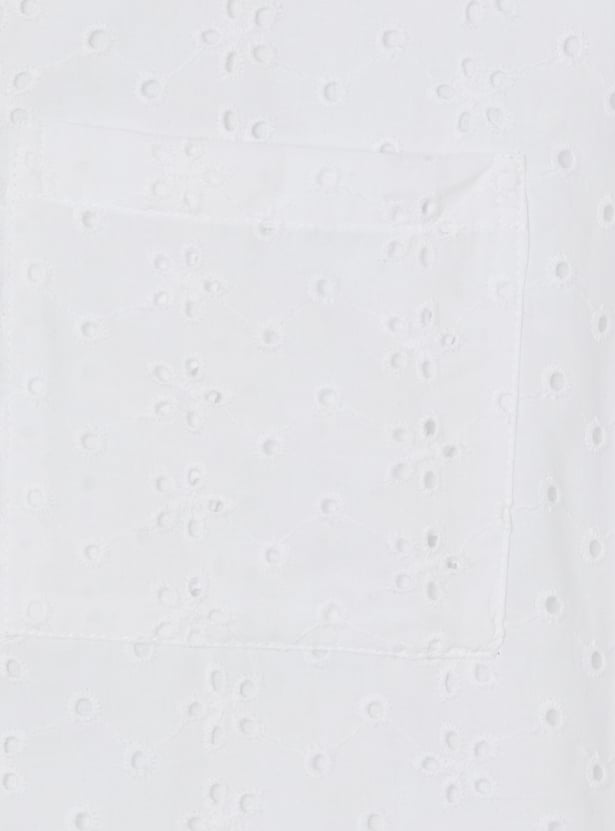 Elegant and breathable, this Schiffli shirt features a spread collar, button closure, and half sleeves. The intricate Schiffli embroidery adds texture and charm, making it a standout piece that blends classic tailoring with delicate detailing.