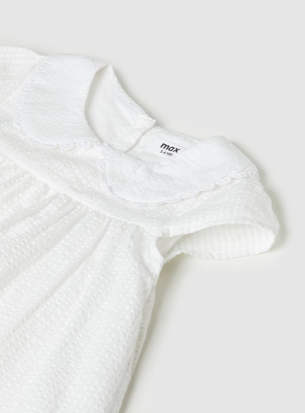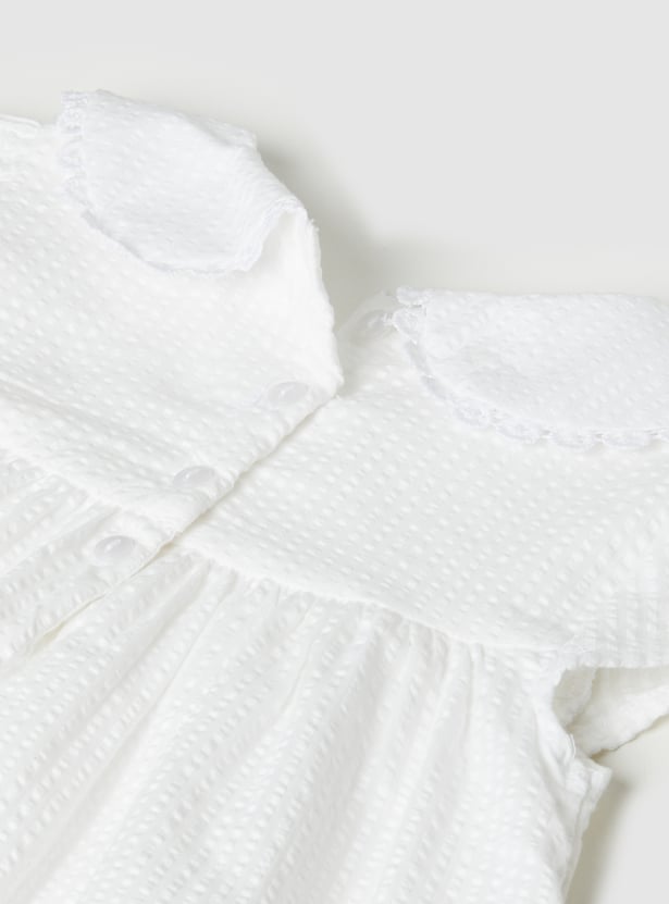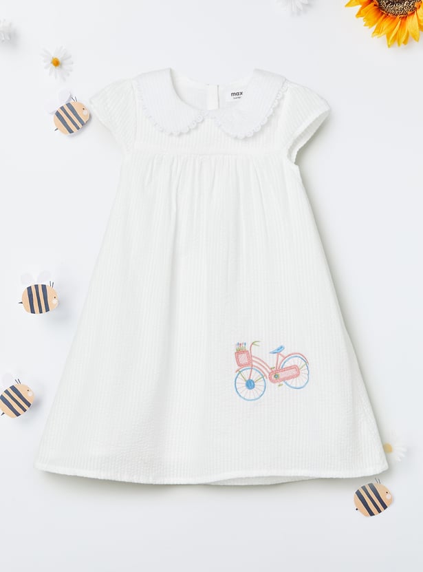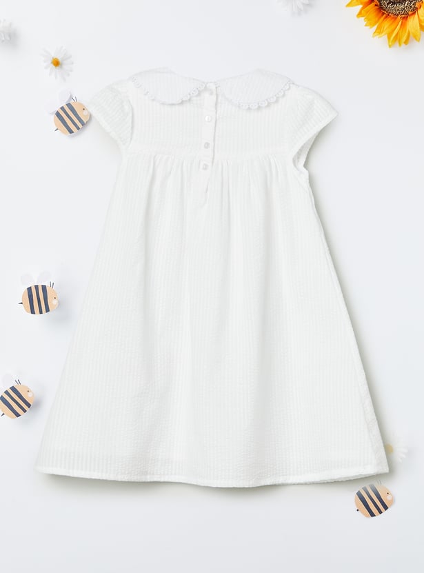 Chic and timeless, this seersucker A-line dress is all about effortless elegance. Featuring a sweet Peter Pan collar, half sleeves, placement embroidery, and a neat back button closure, it blends classic charm with everyday comfort.