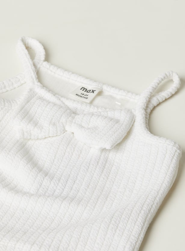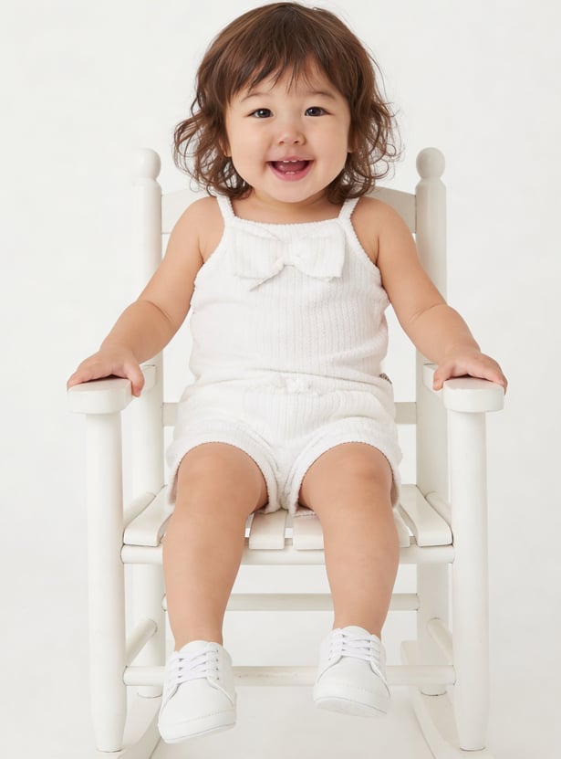 This solid shorts set includes a sleeveless top with spaghetti straps, a square neckline, and a bow detail on the chest. The matching shorts feature side pockets, an elasticated waist, and a drawstring for everyday comfort.