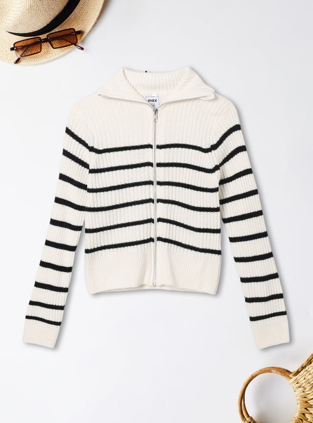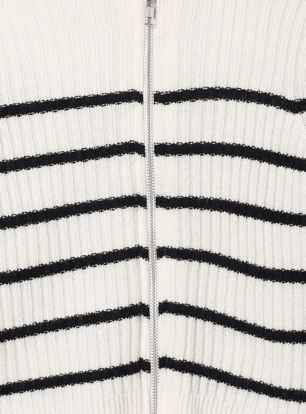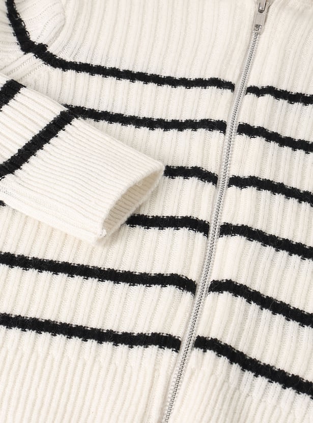 Elevate your layering essentials with this striped cardigan featuring a smooth zip closure, a cozy high neck, and full sleeves. Soft and comfortable, it’s perfect for everyday warmth and style.