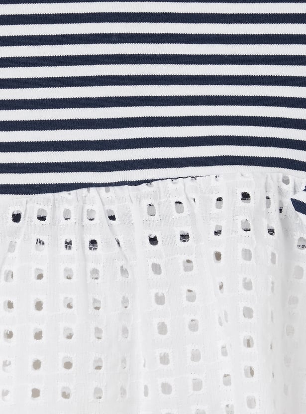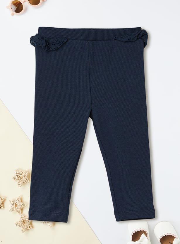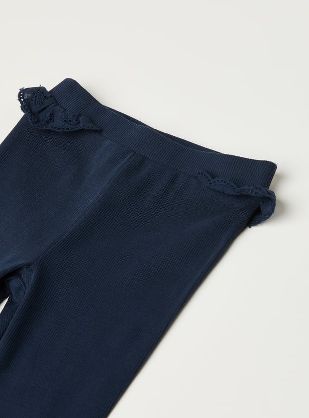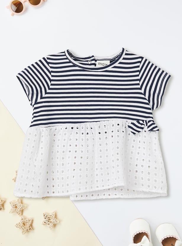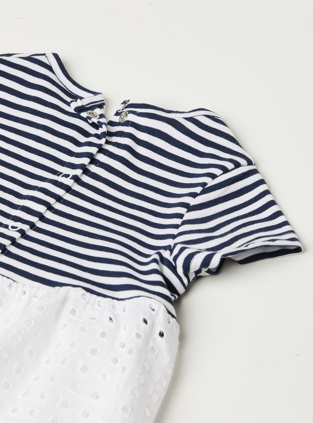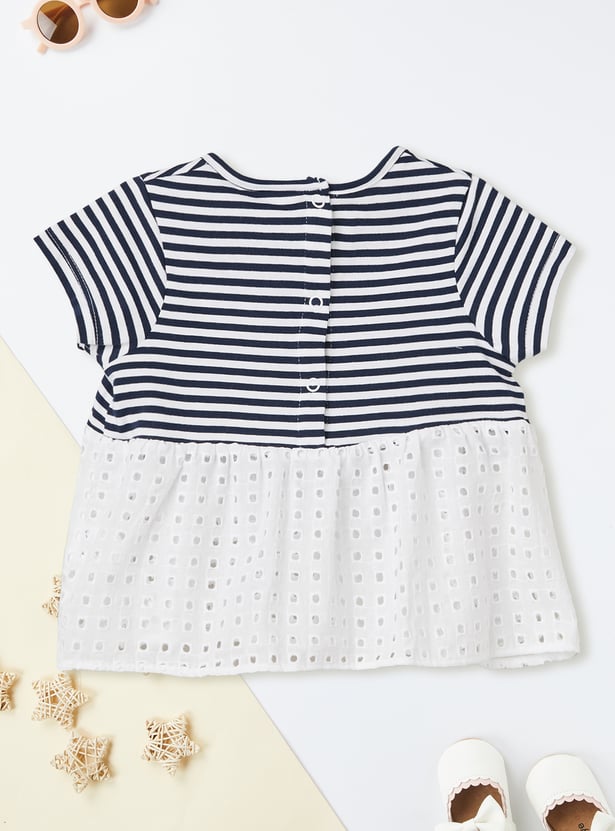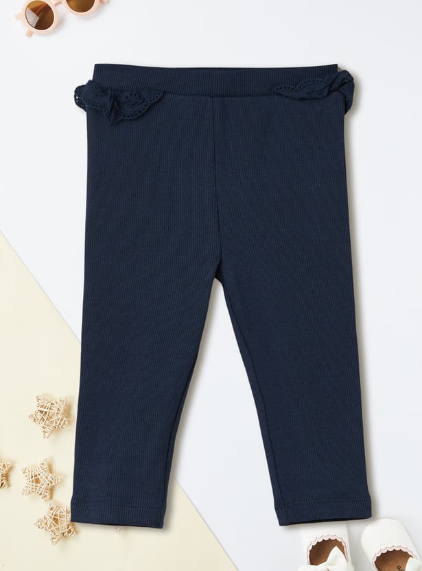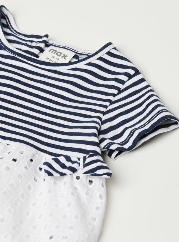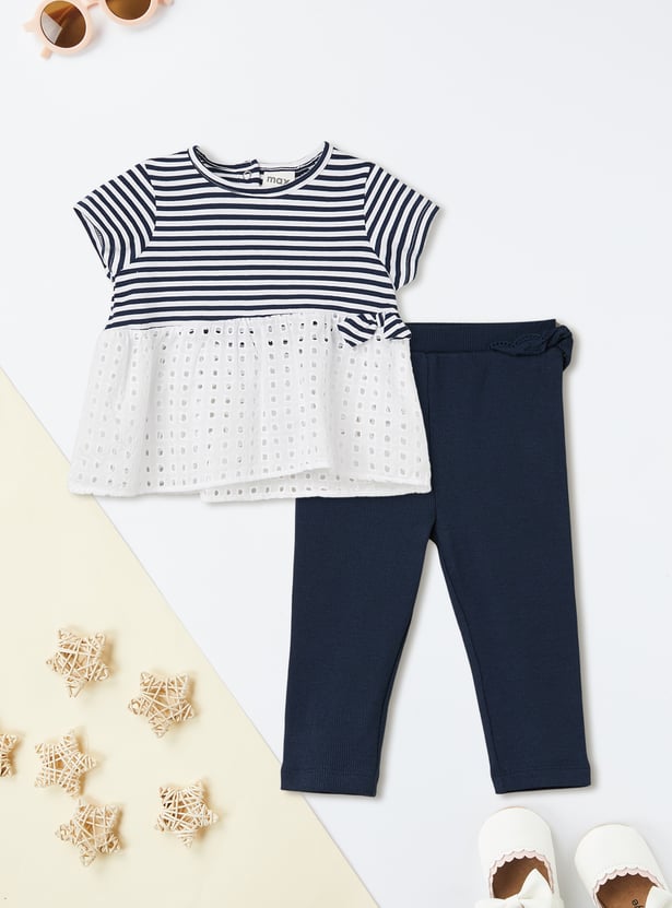 This striped leggings set blends charm and comfort effortlessly. The striped top features a round neck, half sleeves, and a delicate schiffli hem for a playful touch. It’s perfectly paired with solid leggings featuring an elasticated waist for all-day ease.