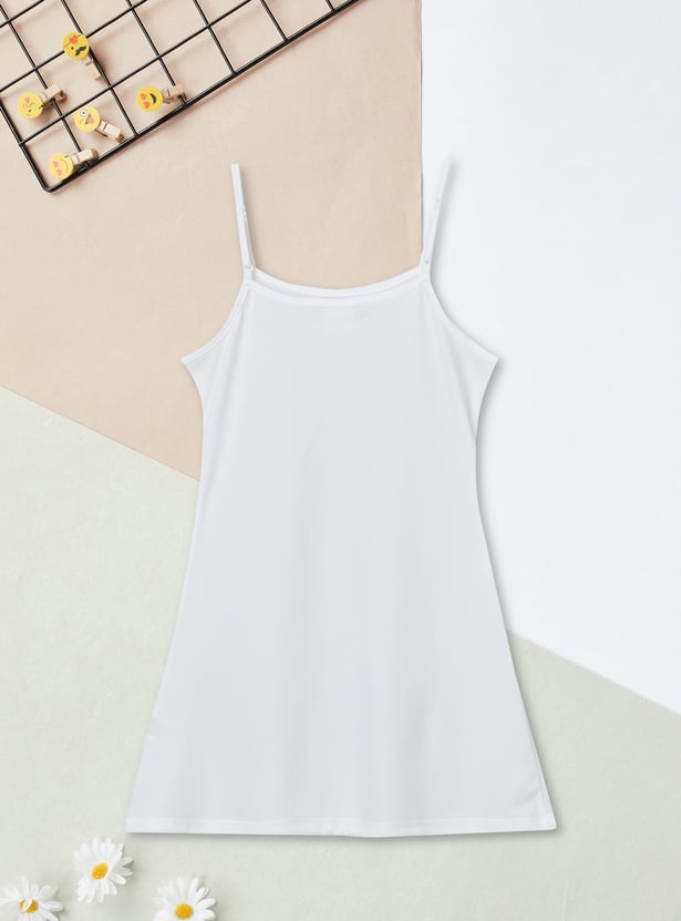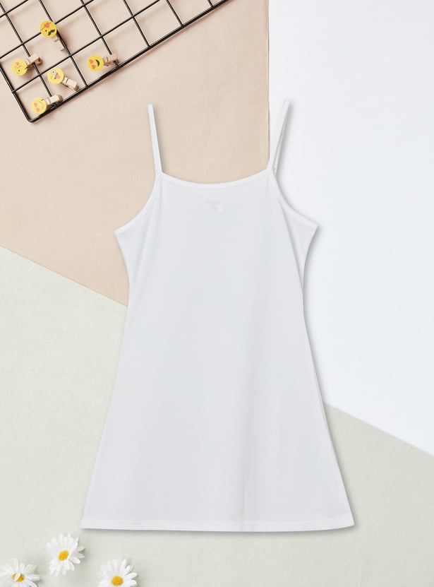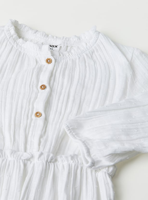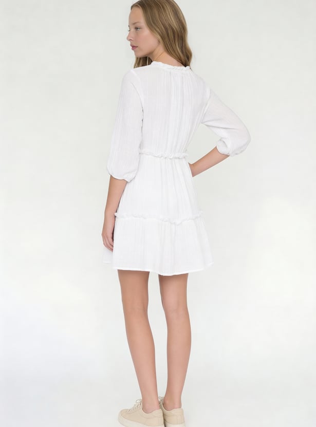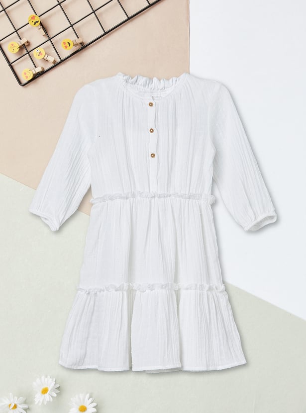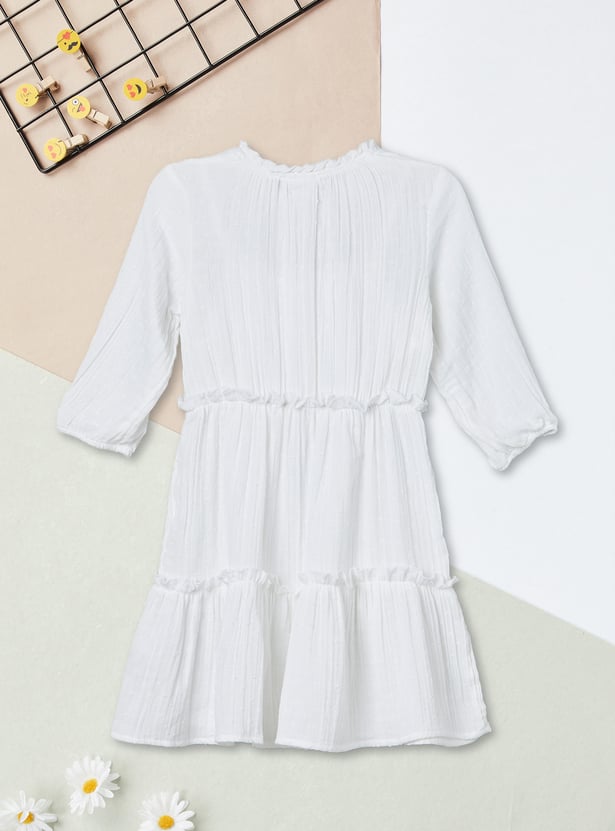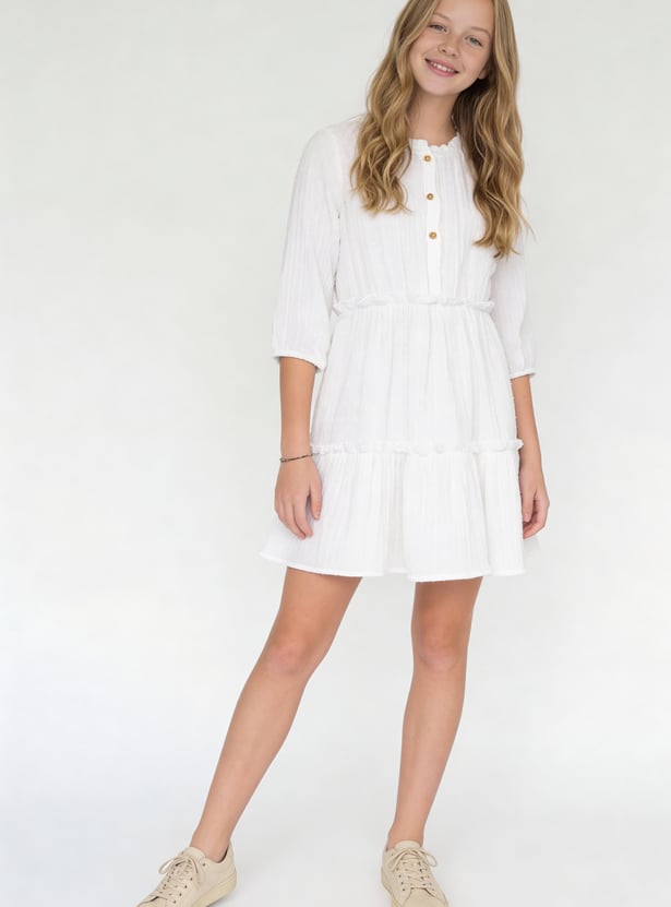 Elegant and versatile, this tiered dress comes with a solid camisole for added comfort. Designed with a round neck and full sleeves, it offers a graceful silhouette enhanced by the tiered detailing.