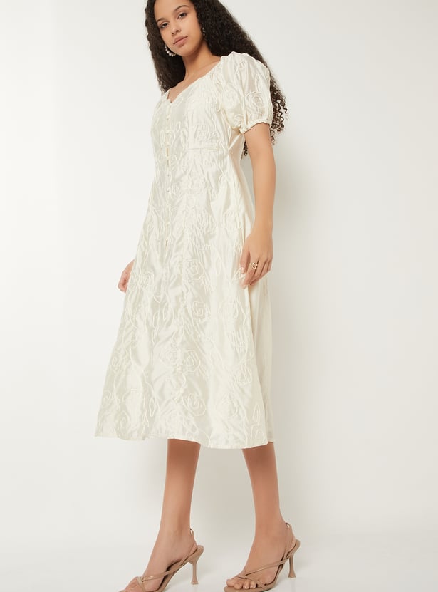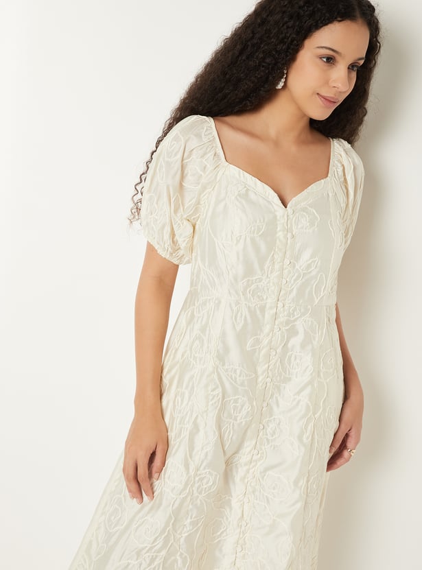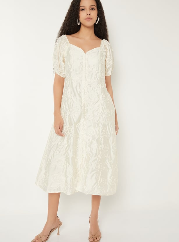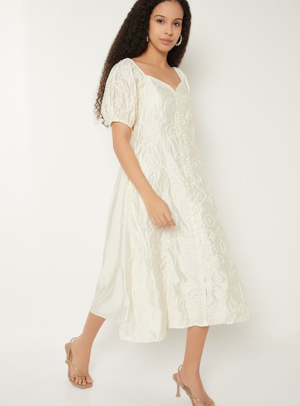 Turn heads with this embroidered A-line midi dress, designed with a romantic sweetheart neckline and elegant half sleeves. The A-line silhouette flatters every figure, while the delicate embroidery adds a touch of timeless charm.
