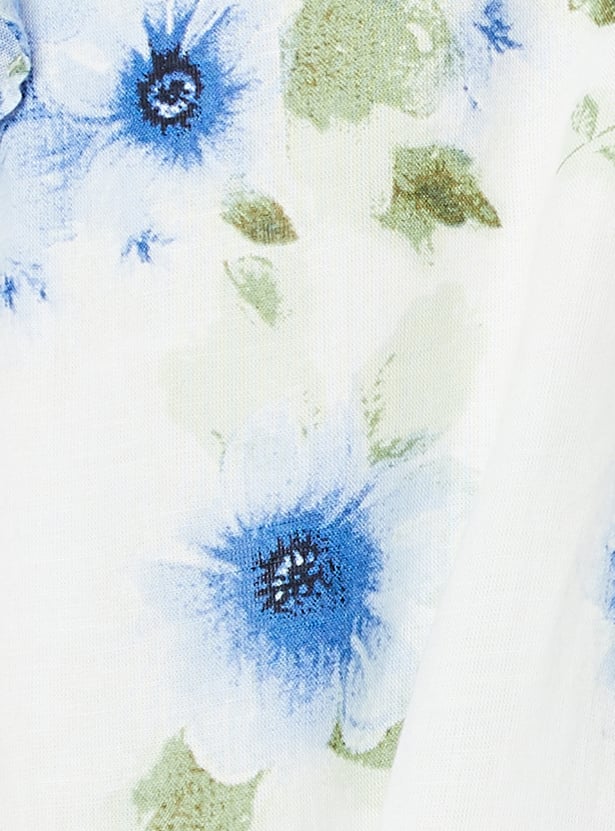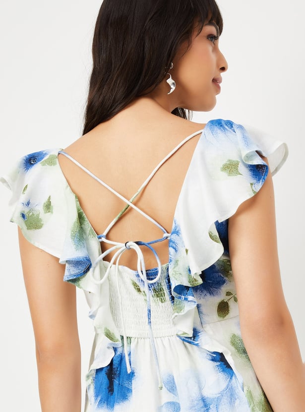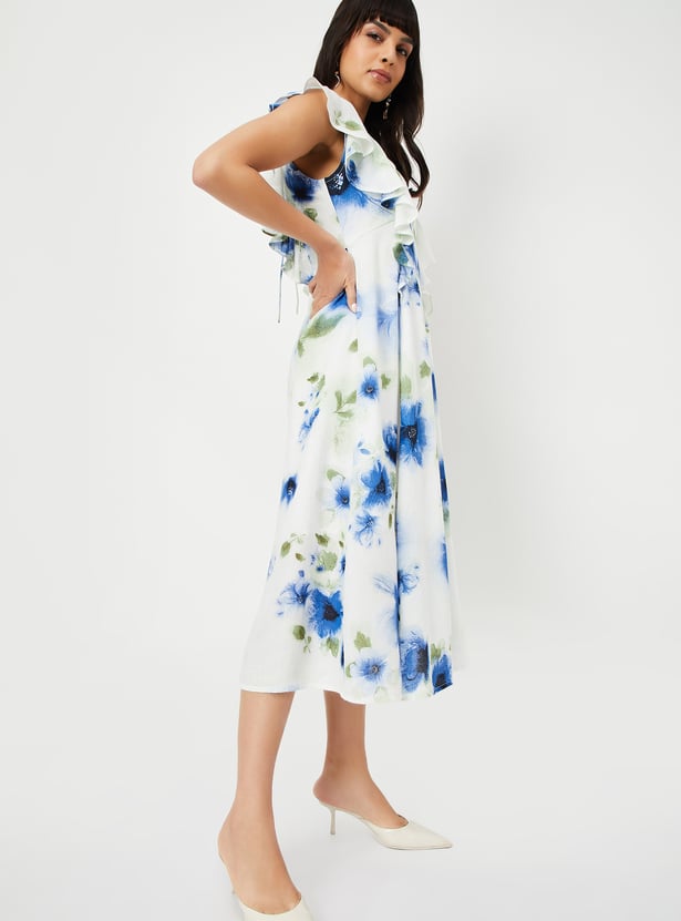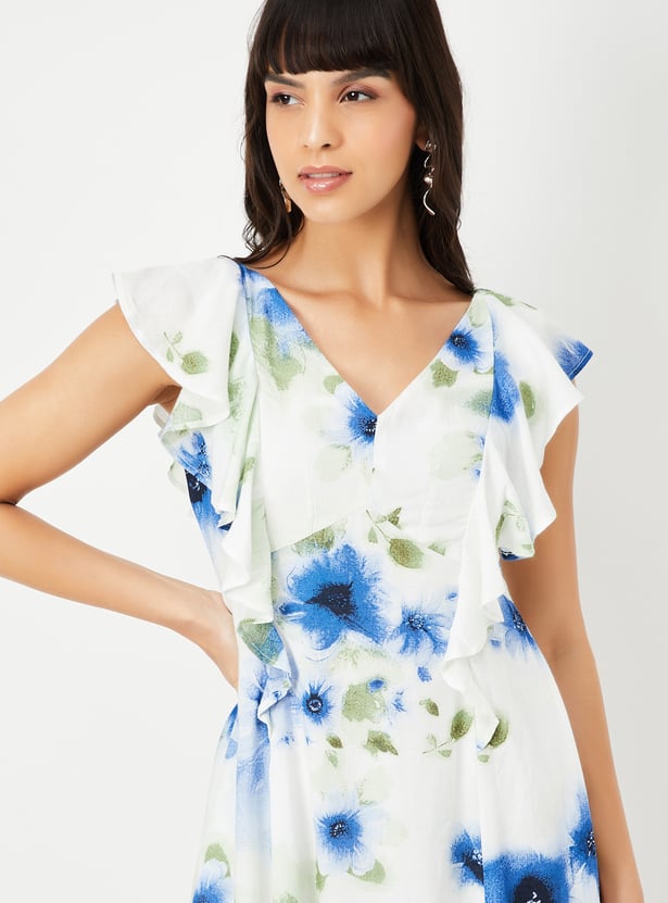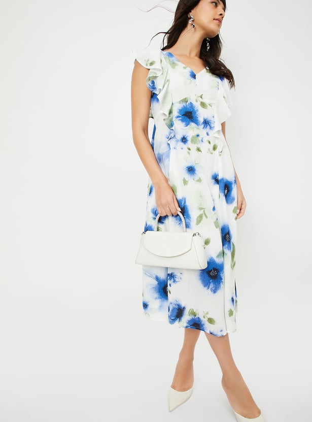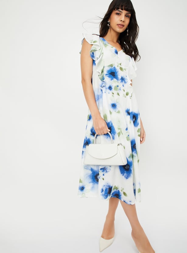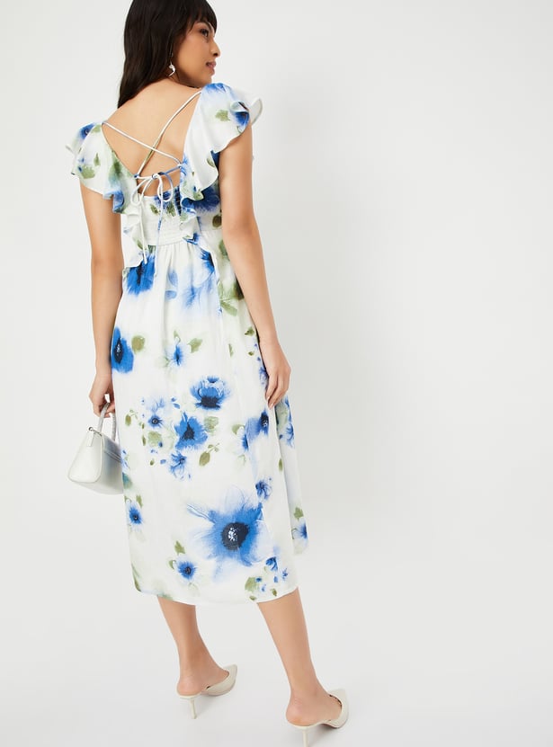 Embrace effortless style with this floral printed A-line midi dress. Featuring ruffles, v neck, cap sleeves, and tie-up back, this dress combines comfort and charm for a feminine look. Model Size :