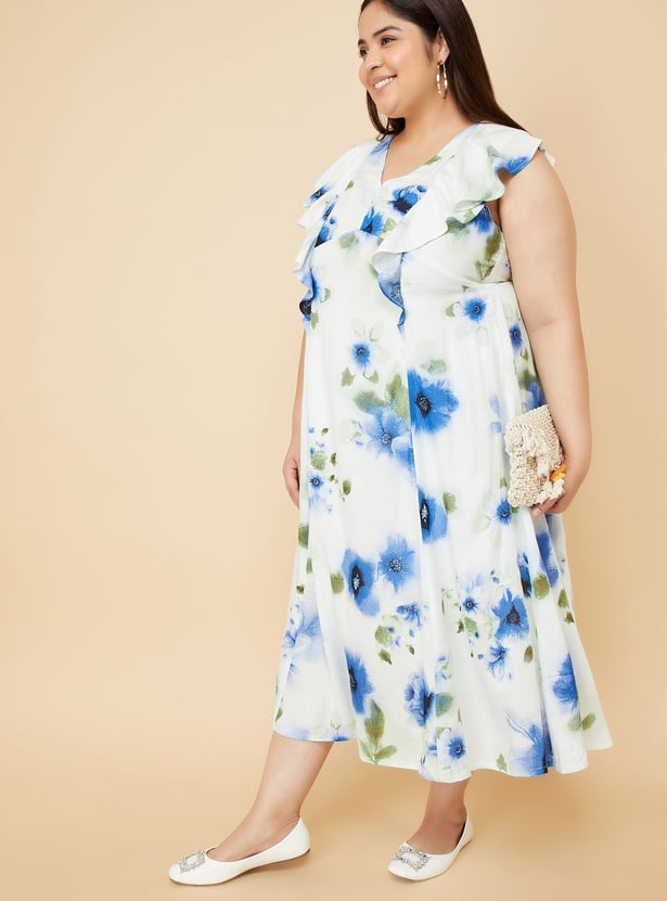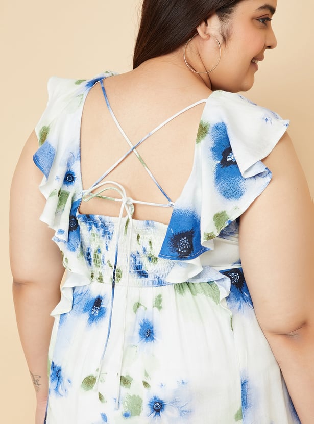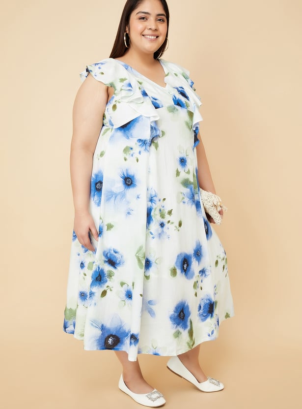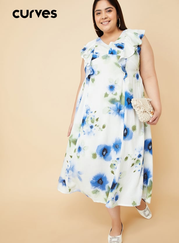 Embrace effortless style with this floral printed A-line midi dress. Featuring ruffles, v neck, cap sleeves, and tie-up back, this dress combines comfort and charm for a feminine look. Model Size :