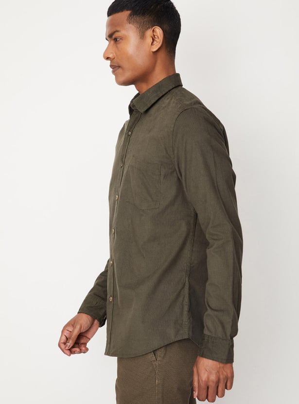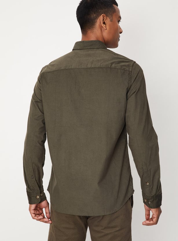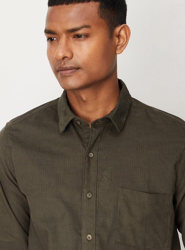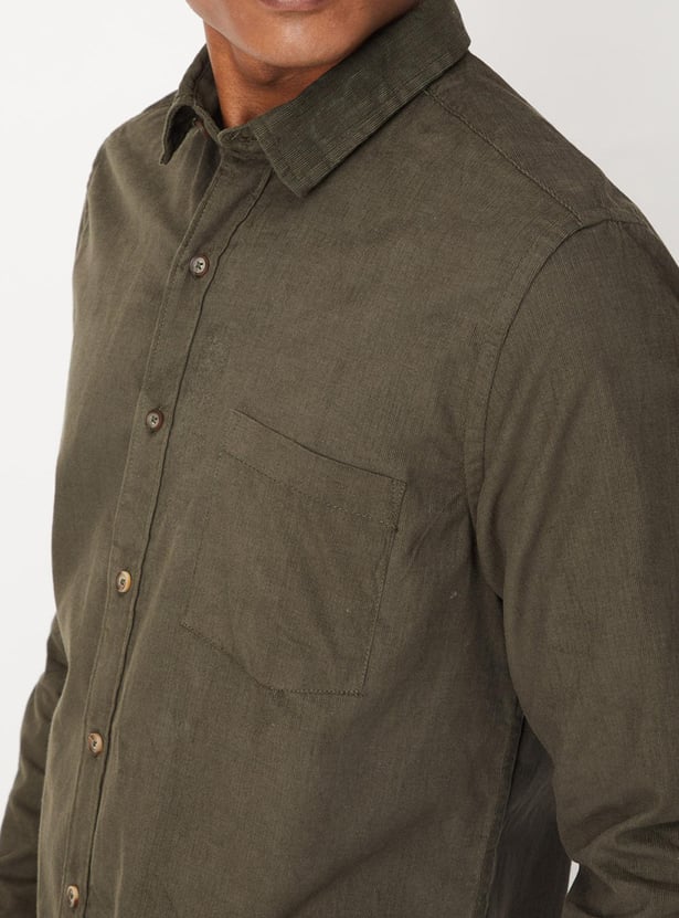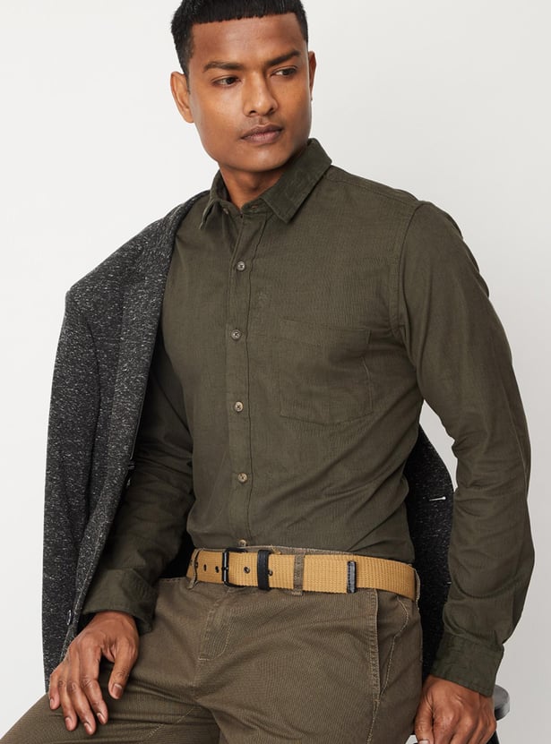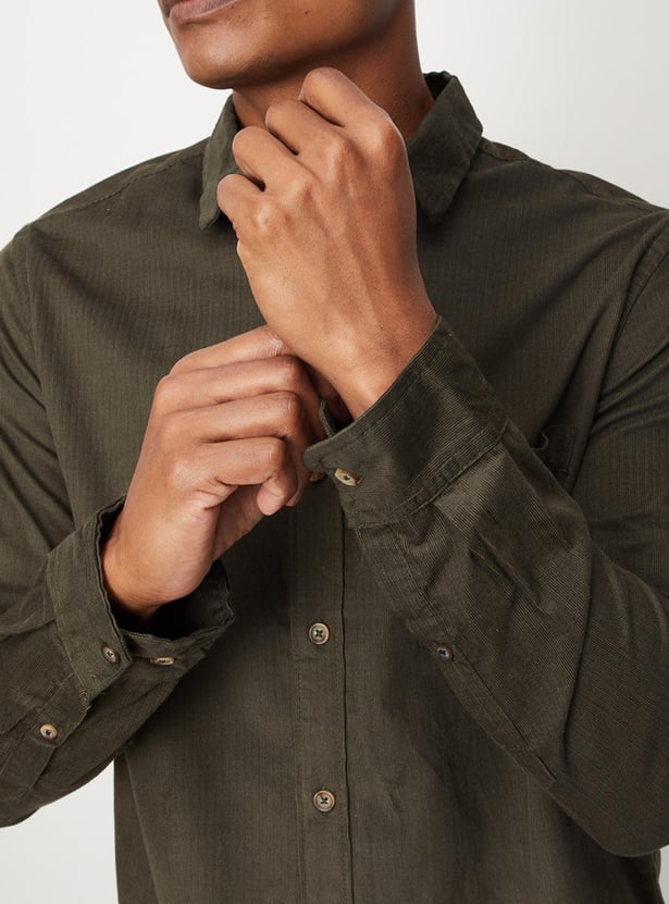 Sharpen your outfit with this shirt that is rendered in a solid tone. It features a spread collar, long sleeves, buttoned cuffs, a chest pocket, and a curved hem. Style Tuck in this shirt in a pair of classic trousers and team it up with sneakers to complete your look.