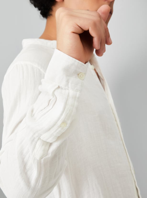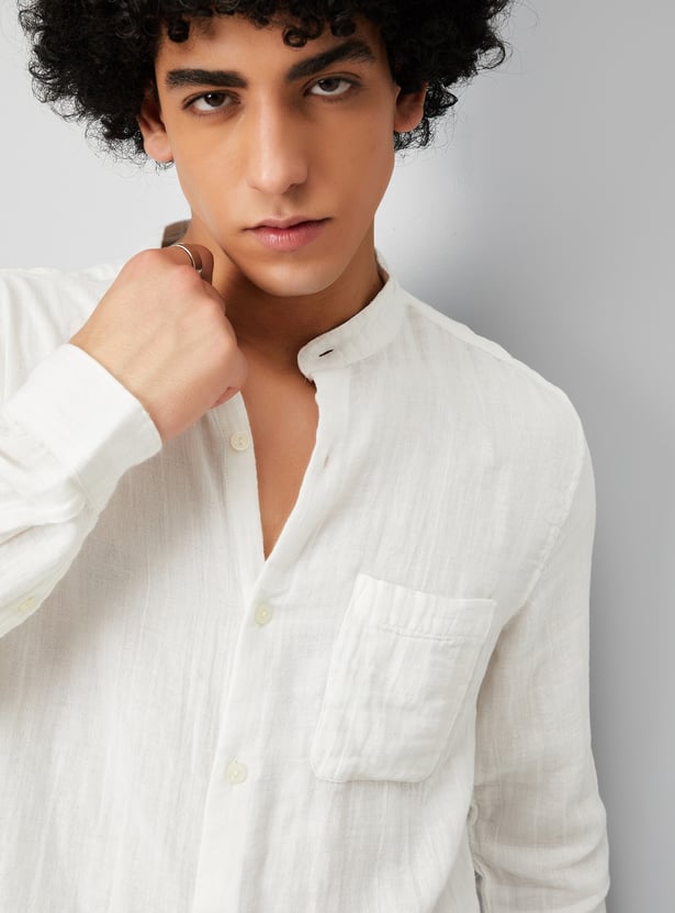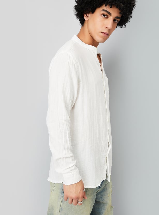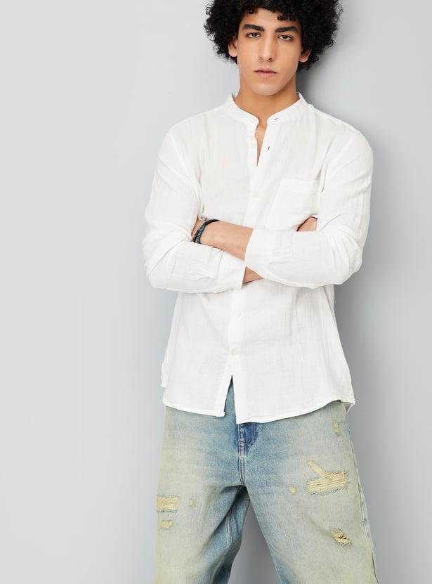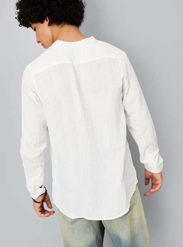 Upgrade your ethnic collection with this crinkled solid kurta. Designed with a band collar, full sleeves, and a patch pocket, it features a button placket for a classic look.