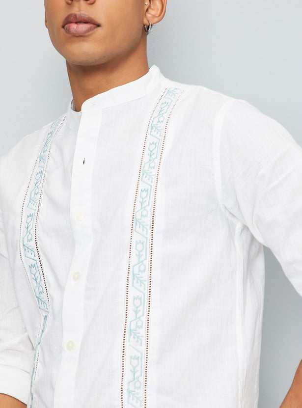 This embroidered short kurta offers a perfect blend of tradition and modern style, featuring a band collar, button placket, and full sleeves with button cuffs. The embroidery adds a refined yet versatile touch, making it a go-to piece for any occasion.