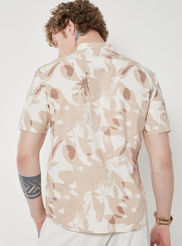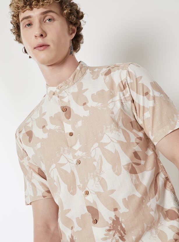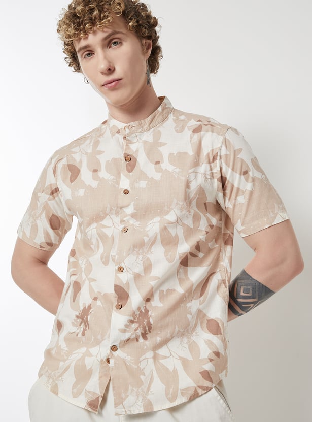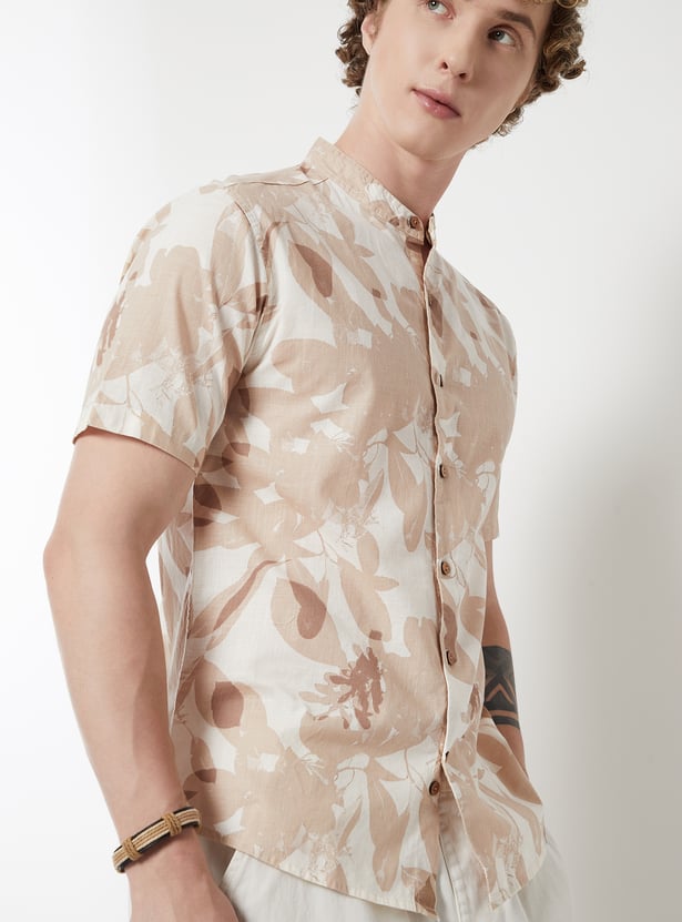 Elevate your ethnic wear with this printed slim fit shirt, designed for a sleek, modern silhouette. It features a band collar, button placket, and comfortable half sleeves. The print adds a refined touch.