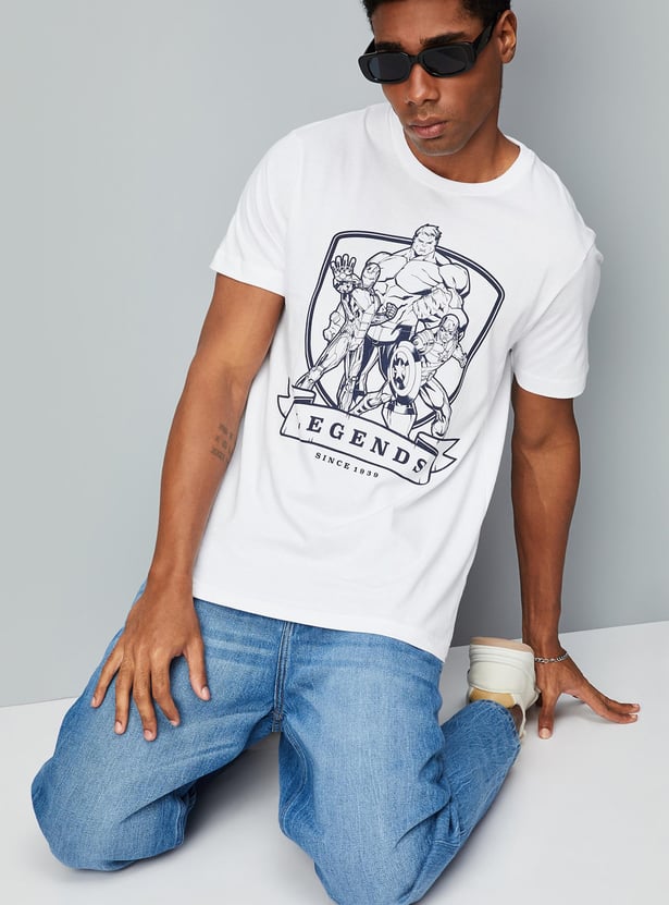 Look trendy in this T-shirt highlighted with Avengers-themed prints. It has a crew neck, short sleeves, and a slim-fit profile. Pair this tee with jeans and sneakers for an updated weekend look.