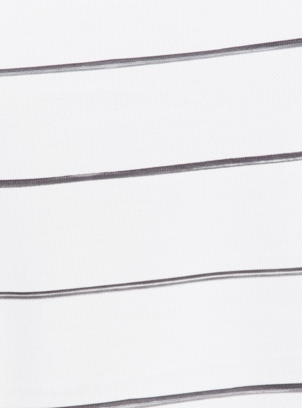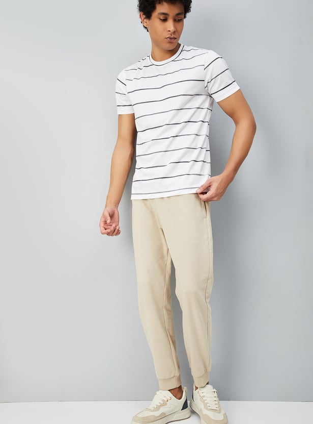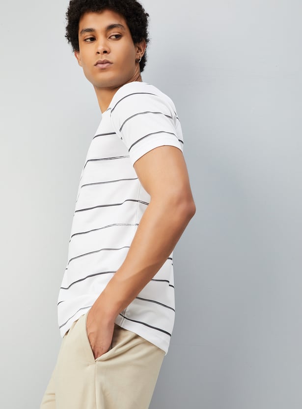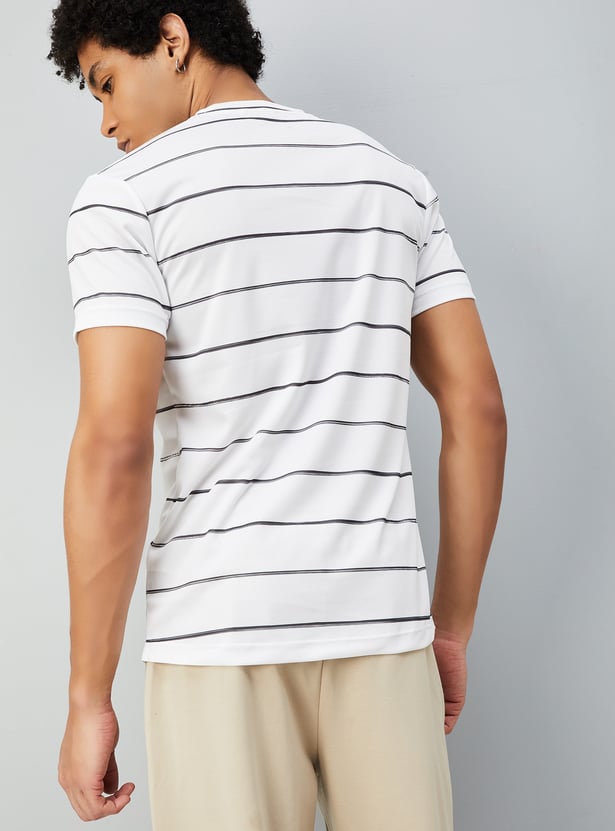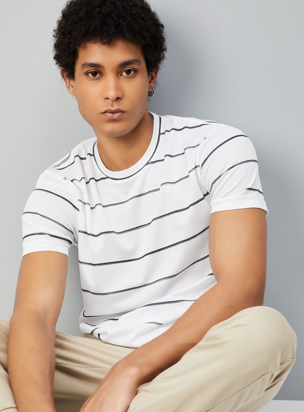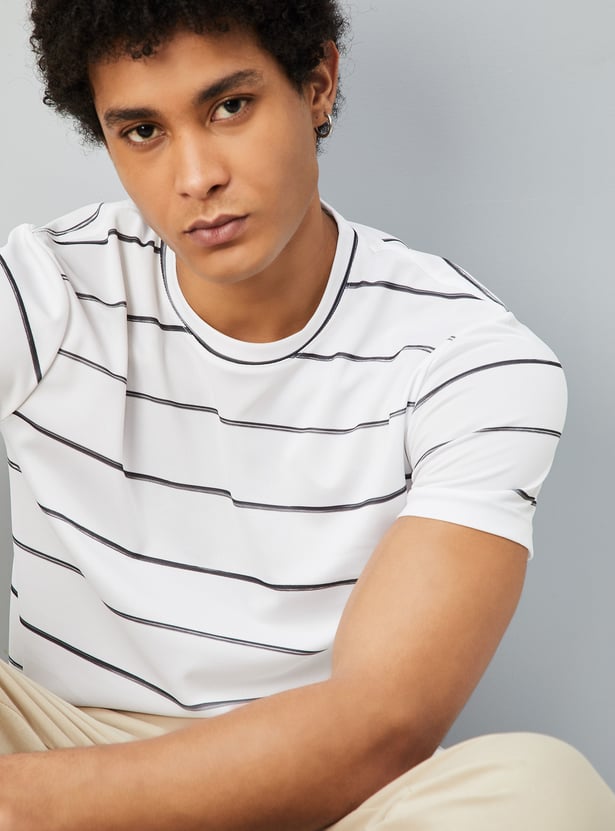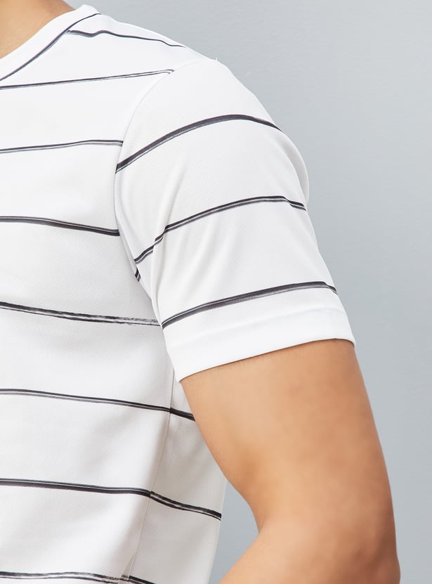 Stay effortlessly sporty with this slim-fit striped athleisure t-shirt, featuring a classic crew neck and half sleeves for a sleek, comfortable fit. Designed for both style and performance.