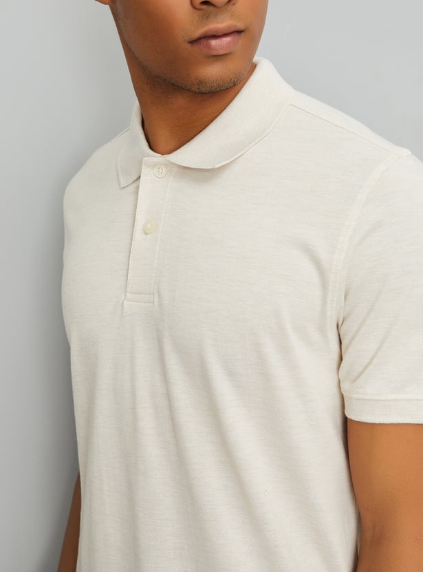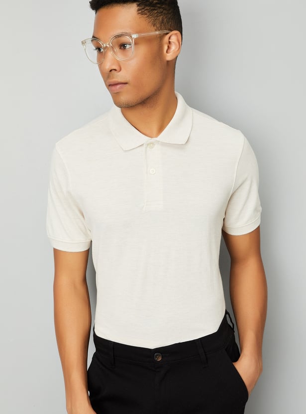 This solid polo T-shirt combines comfort and style with its collared design, half sleeves, and classic button closure. The subtle texture adds depth and interest to the traditional polo, making it perfect for both casual and semi-casual occasions.