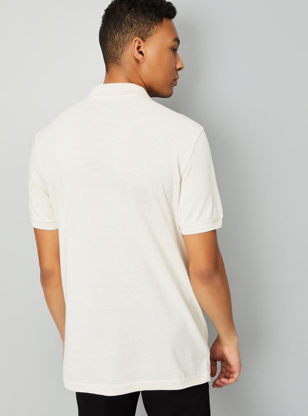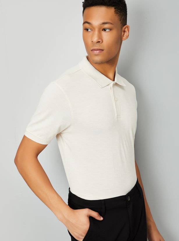 This solid polo T-shirt combines comfort and style with its collared design, half sleeves, and classic button closure. The subtle texture adds depth and interest to the traditional polo, making it perfect for both casual and semi-casual occasions.