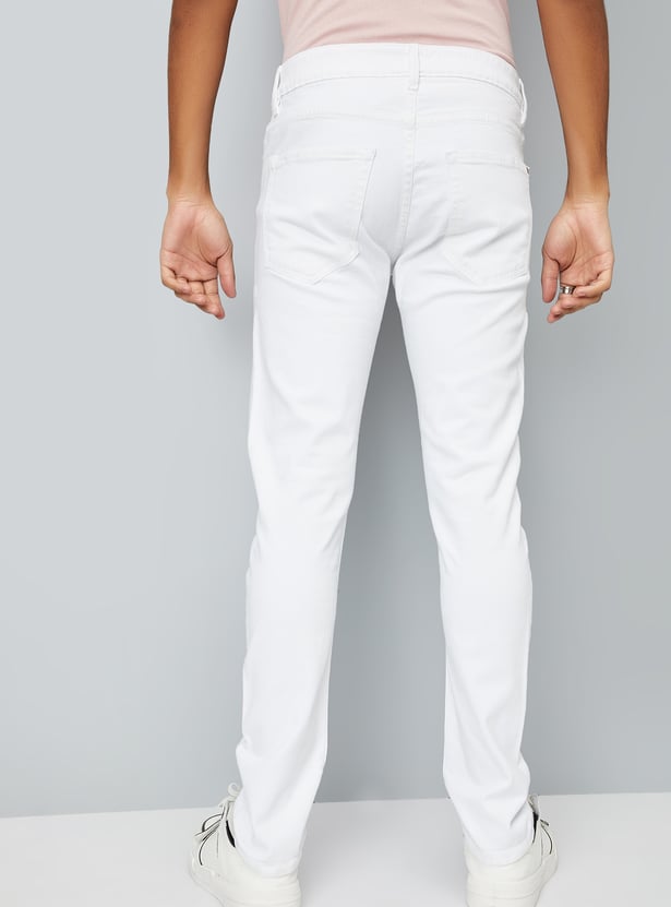 These solid skinny-fit jeans are a wardrobe essential, featuring a sleek silhouette, a classic 5-pocket design, mid-rise, and a secure button closure. Their versatile, minimal design makes them a perfect match for both casual and smart-casual outfits.