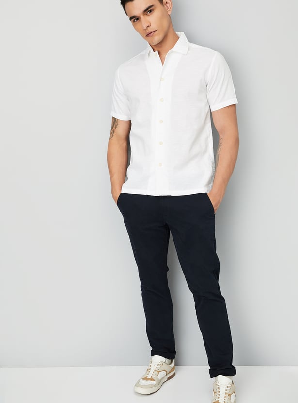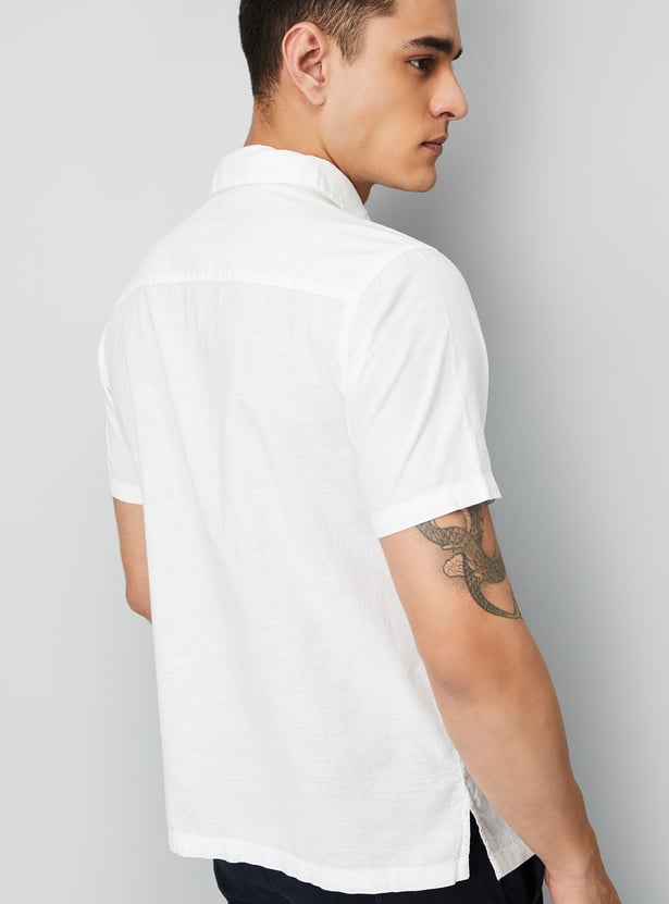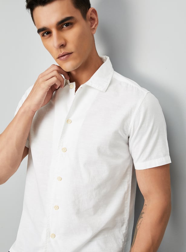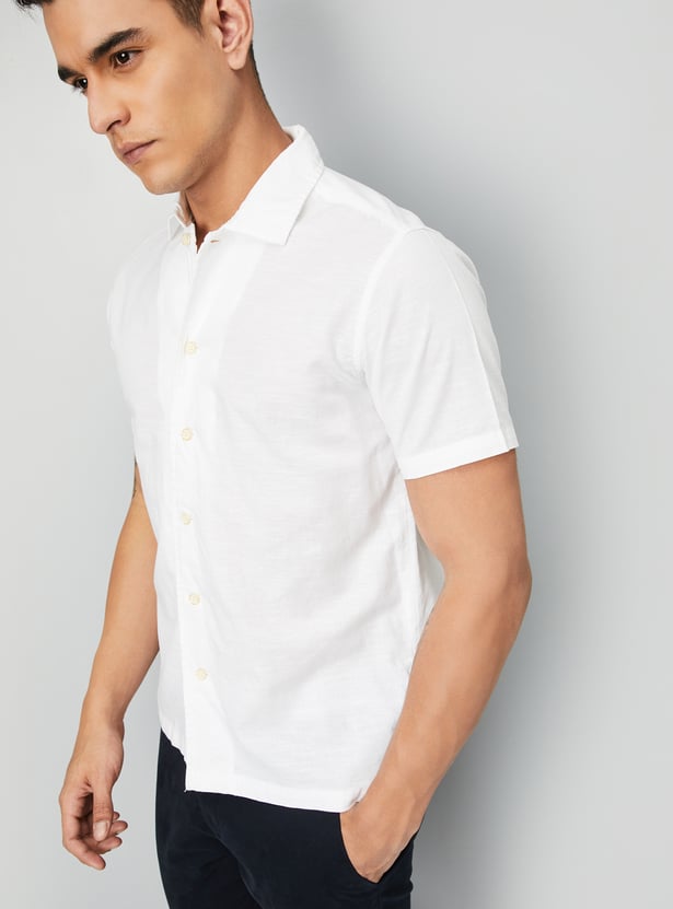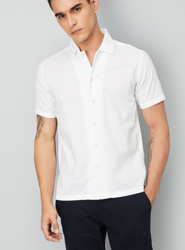This solid shirt is a versatile wardrobe essential, featuring a classic spread collar, half sleeves, and a button placket. Its timeless design makes it suitable for both casual and semiformal occasions.