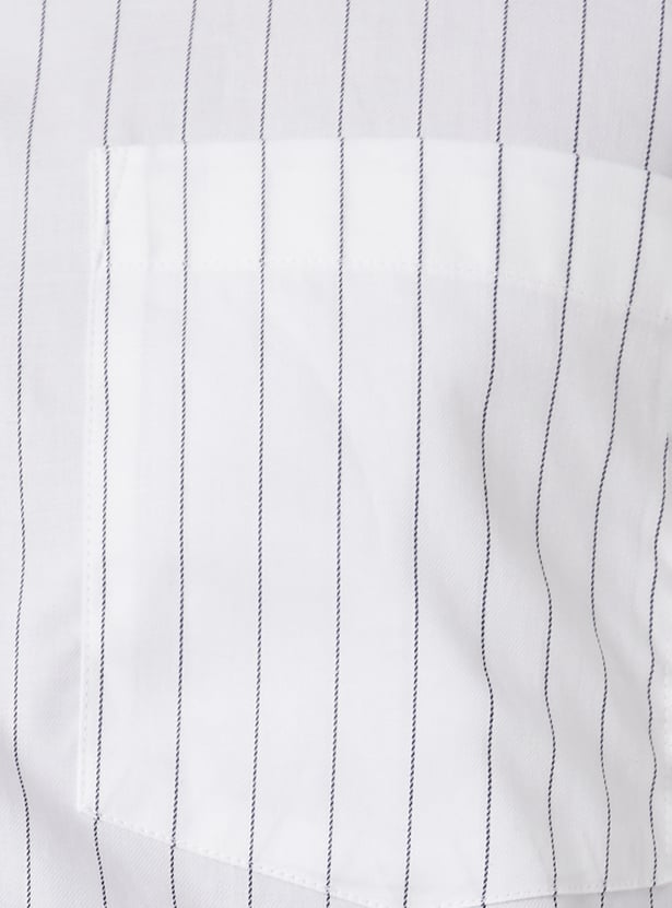 Stay sharp in this striped slim fit formal shirt, featuring a spread collar, button placket, full sleeves with button cuffs, and a classic patch pocket. Tailored for a sleek silhouette with timeless appeal.