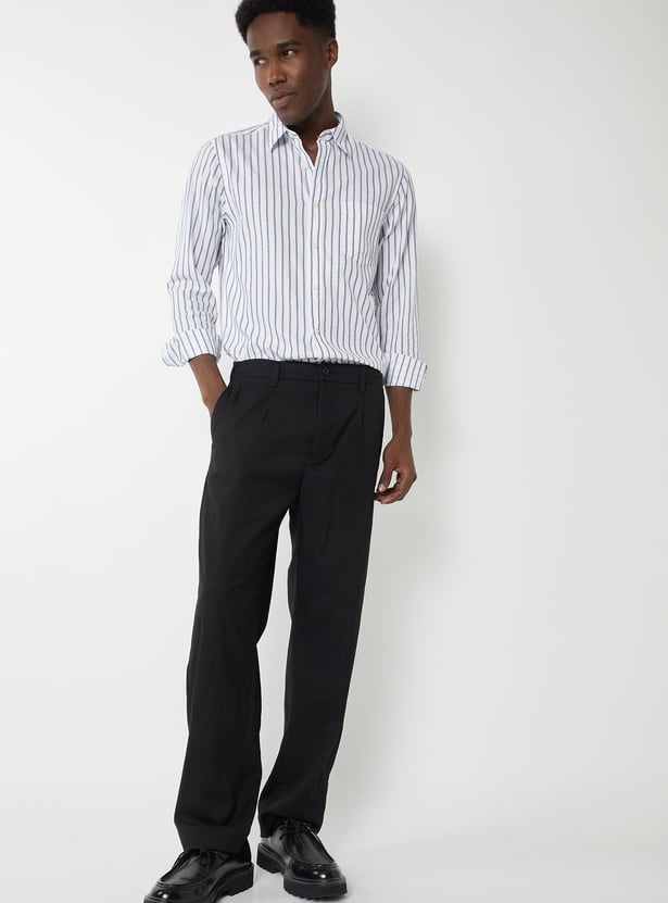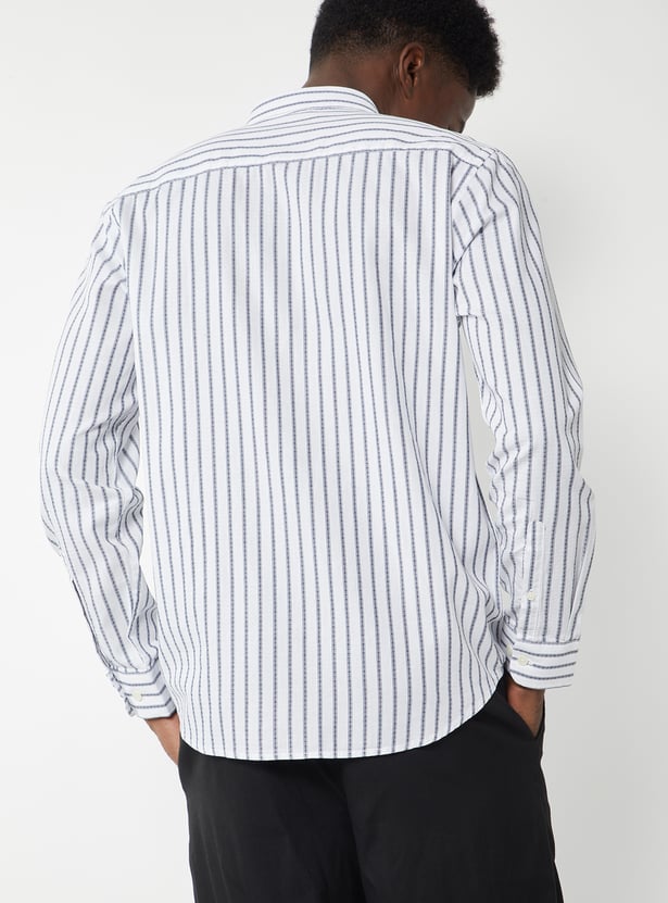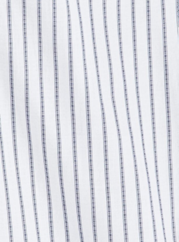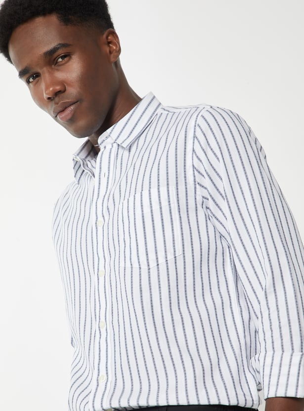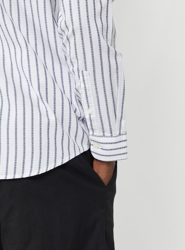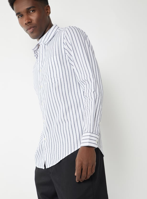 A refined striped slim‑fit shirt featuring a spread collar, full sleeves with cuffs, a button placket, and a patch pocket. Tailored for a sleek silhouette, it blends classic detailing with modern style.