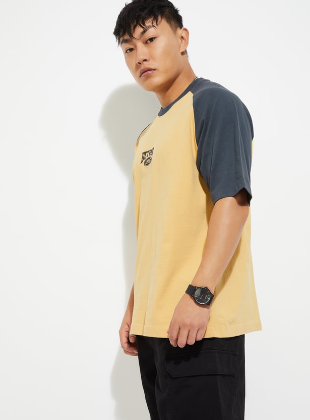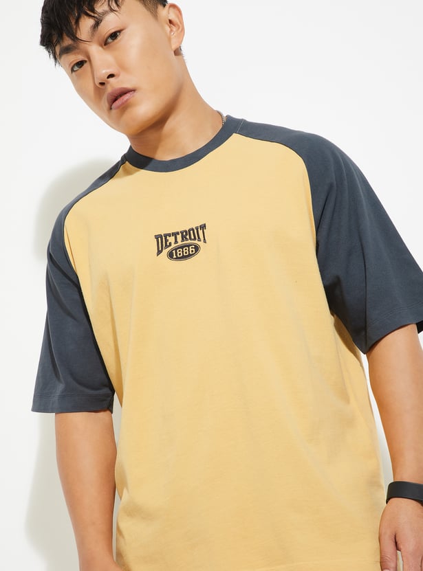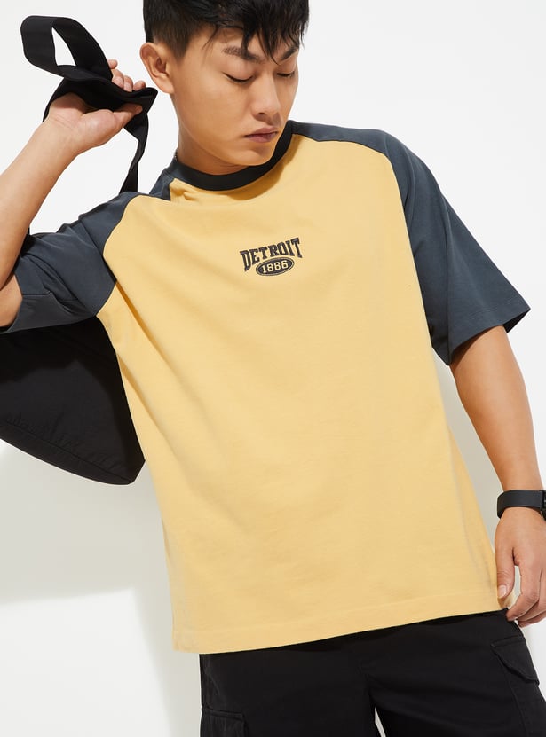 Bring sporty street style to everyday dressing with this colourblock oversized T-shirt. It is designed with a classic crew neck and half raglan sleeves. This T-shirt is finished with bold colourblocked and chest embroidery for a standout casual look.