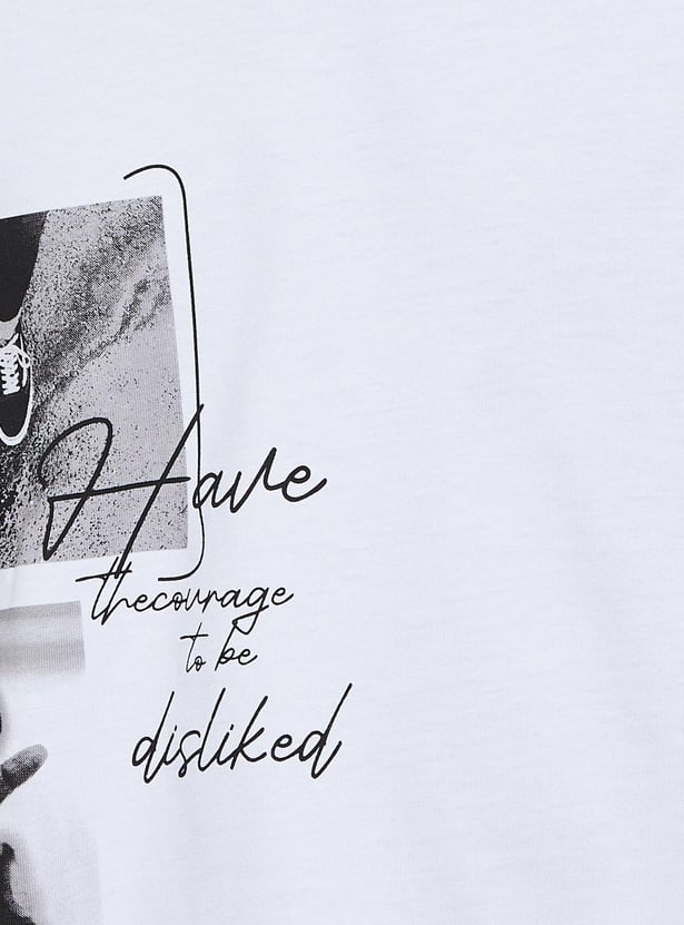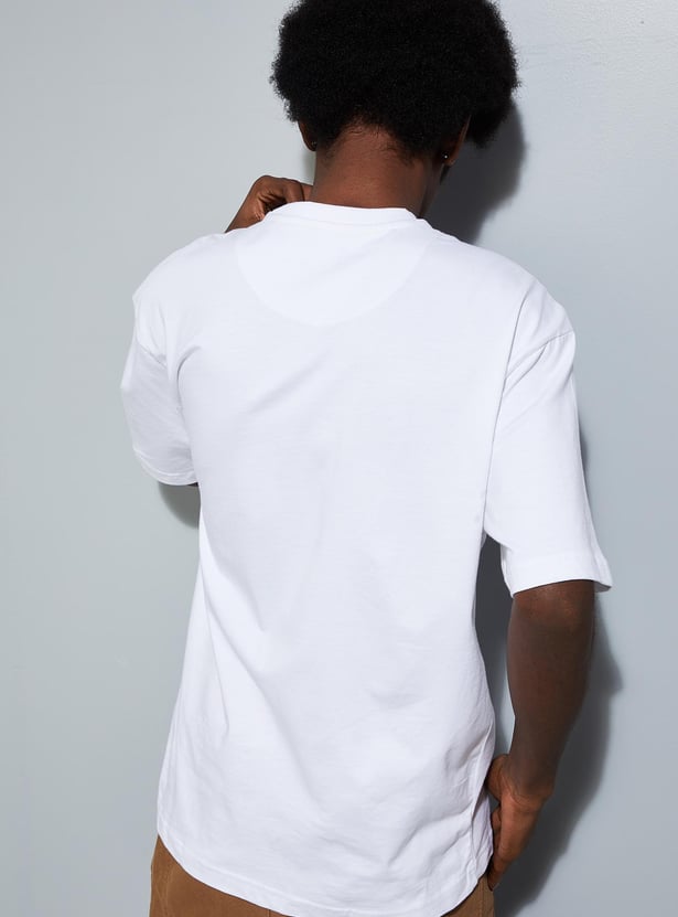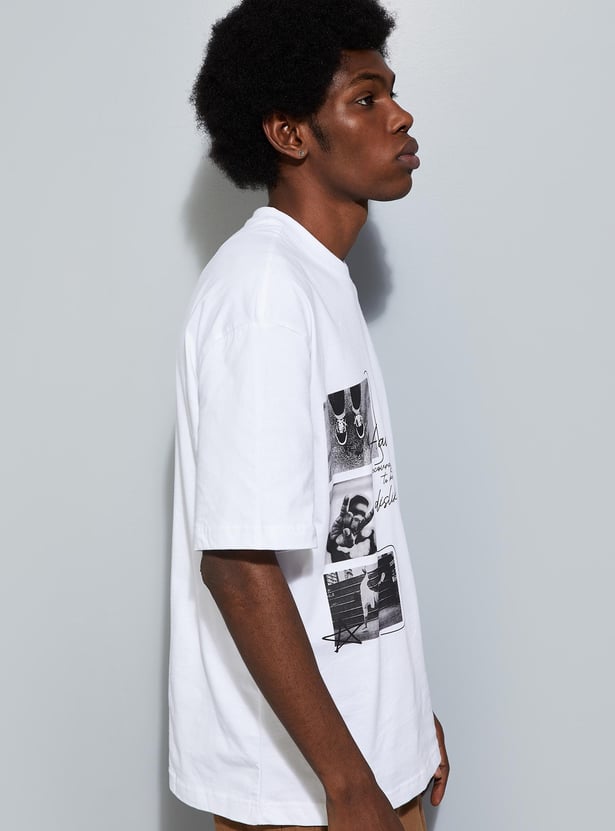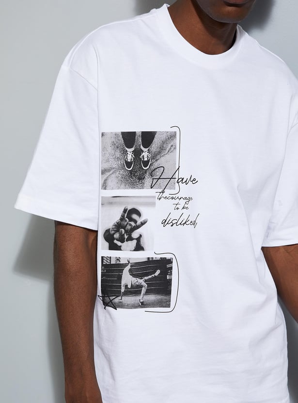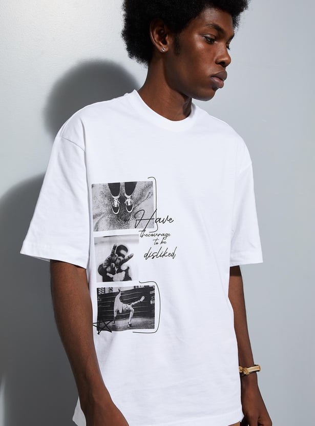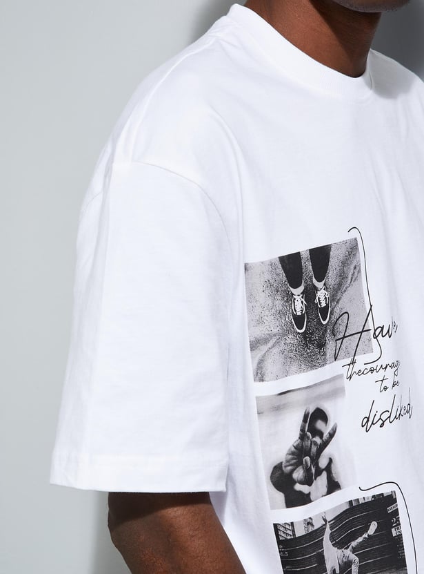 Build your basic wardrobe with this T-shirt updated with graphic prints on the front. It is designed with a crew neck, short sleeves, and an oversized profile.