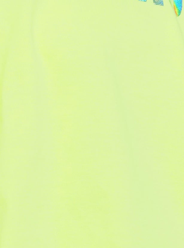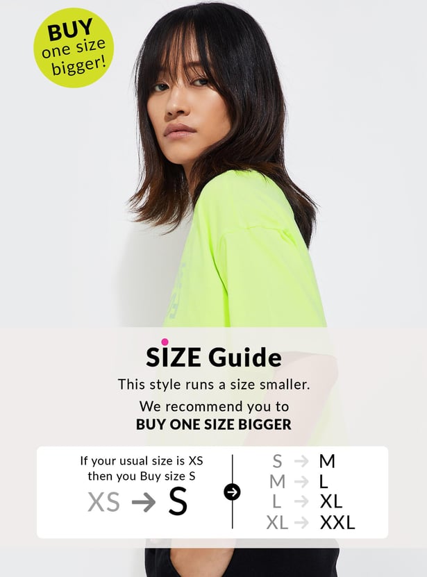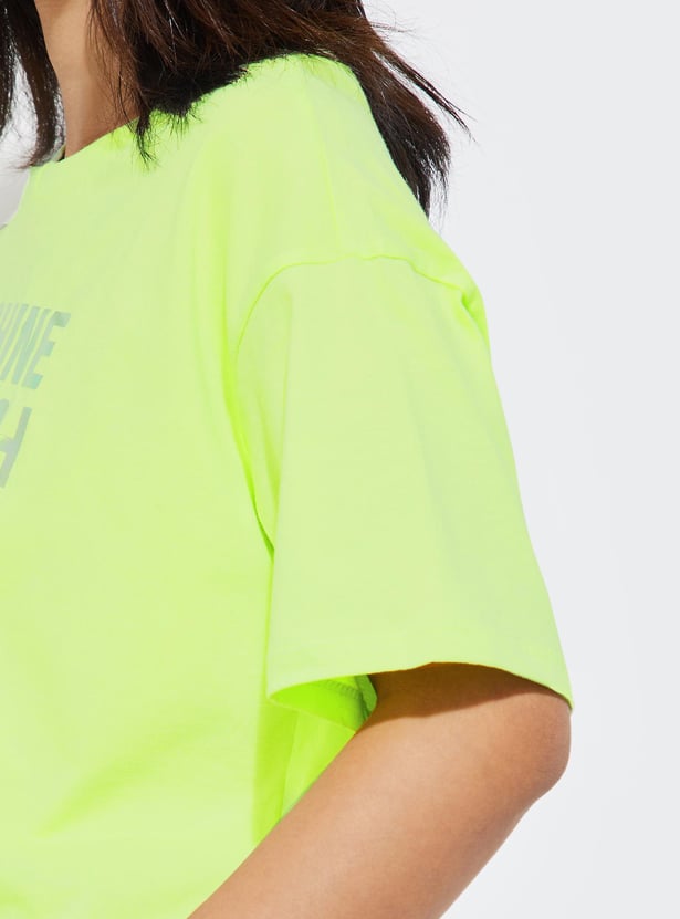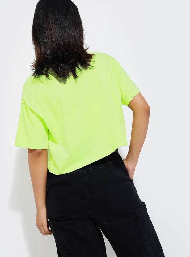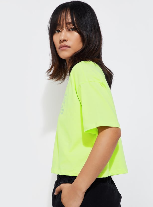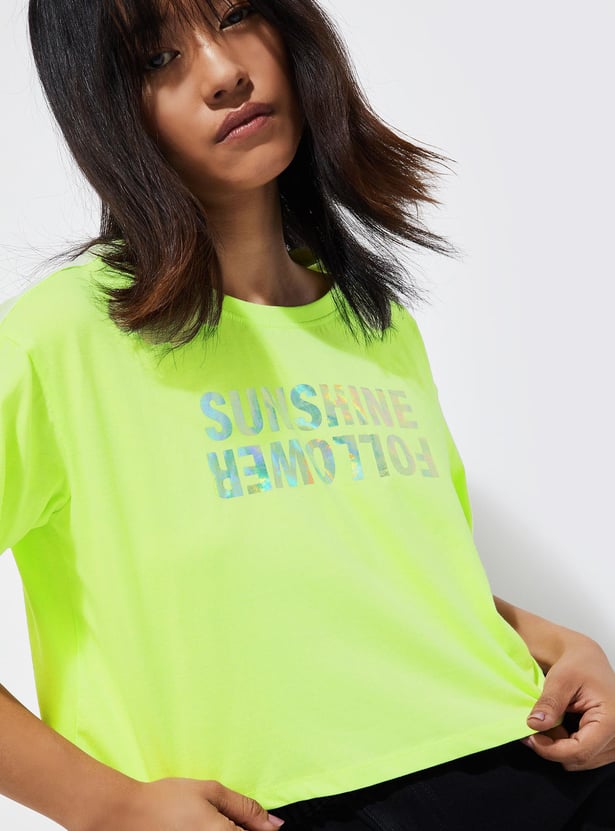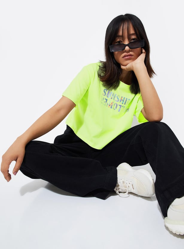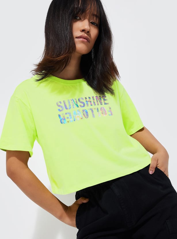 Embrace the laid-back style with this T-shirt. It is designed with a round neck, drop shoulders, and a short profile. The shimmery graphic print at the chest elevates the look.