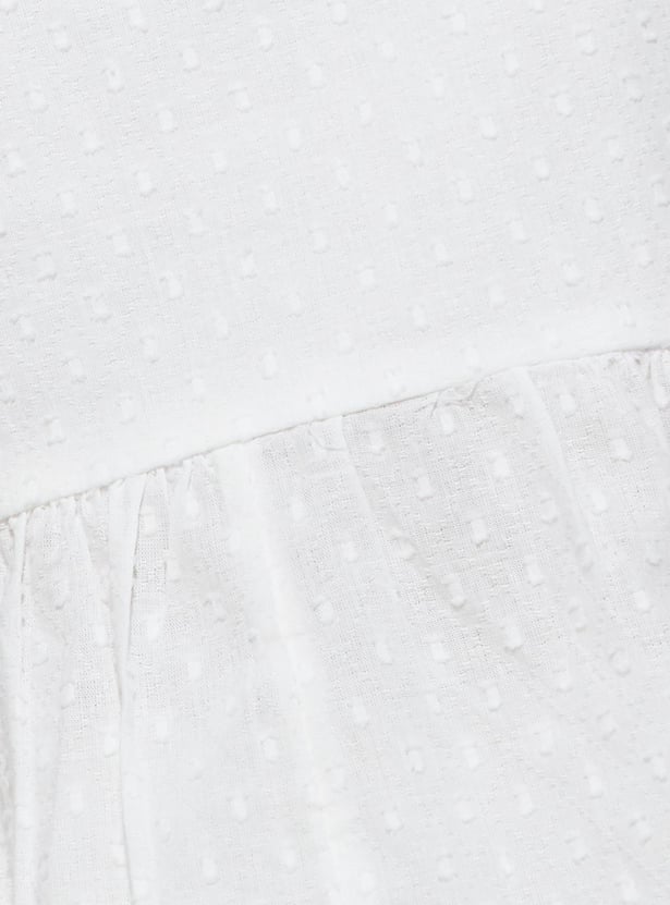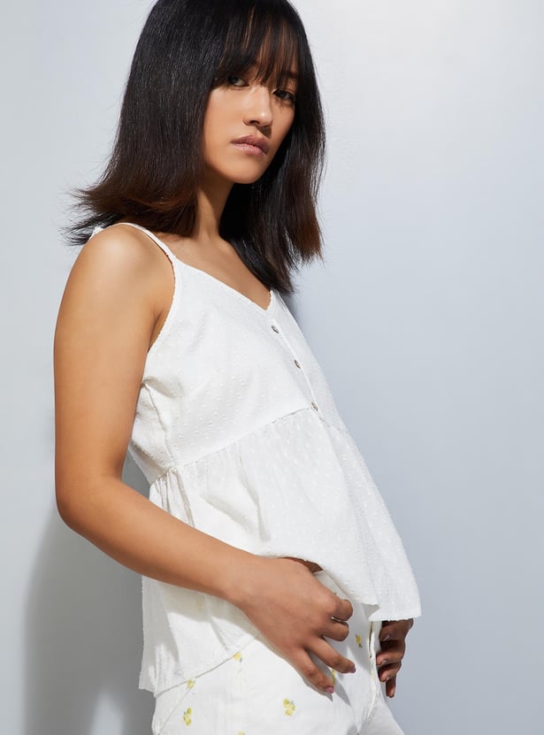 Elevate your summer style with this breezy top, featuring a dobby woven textured surface, V-neckline, button closure, and spaghetti straps. Complete with a playful peplum hem.