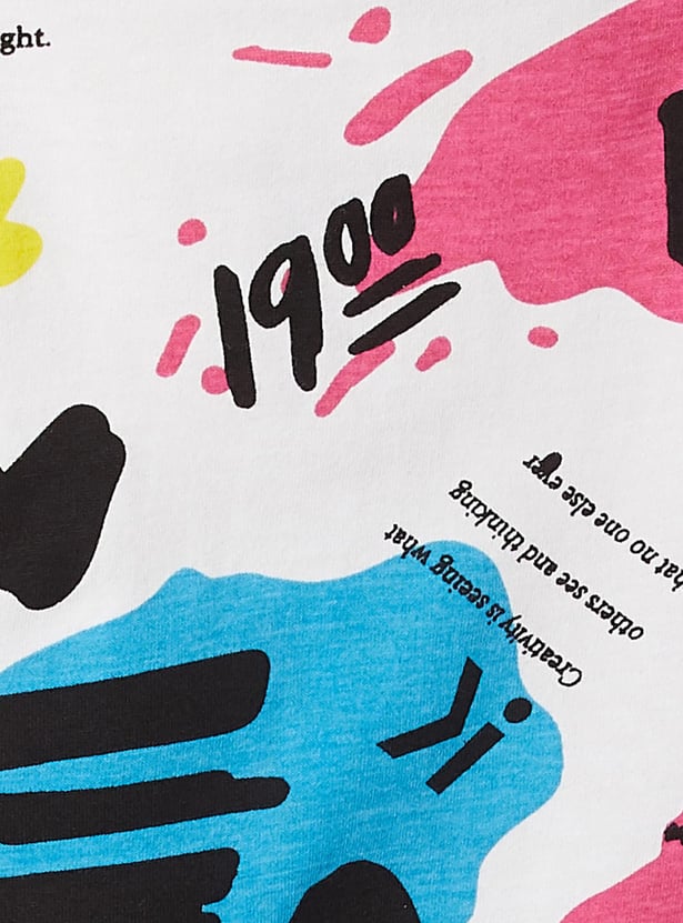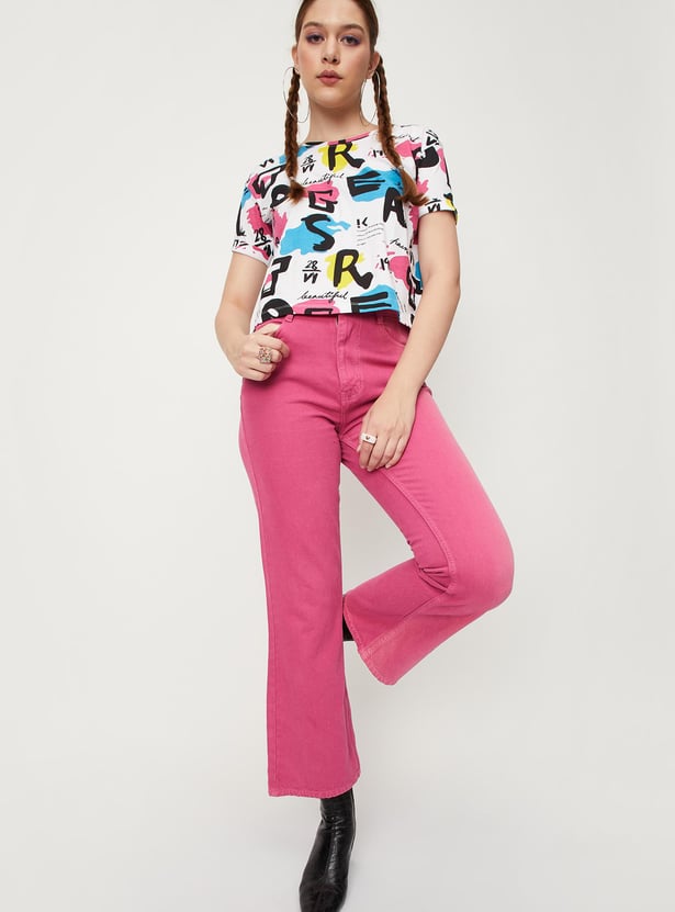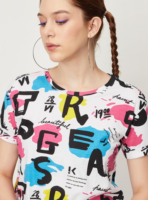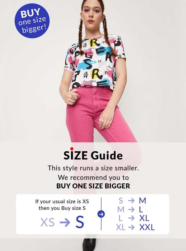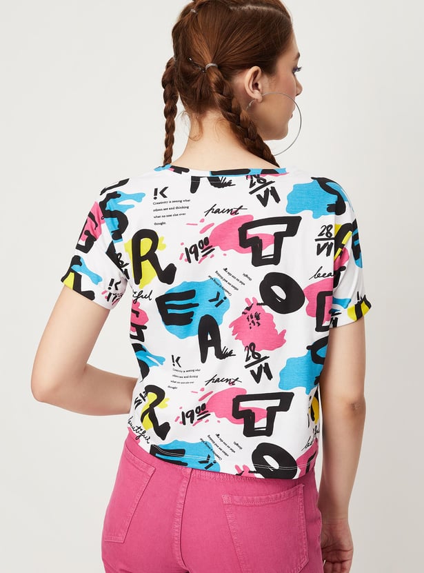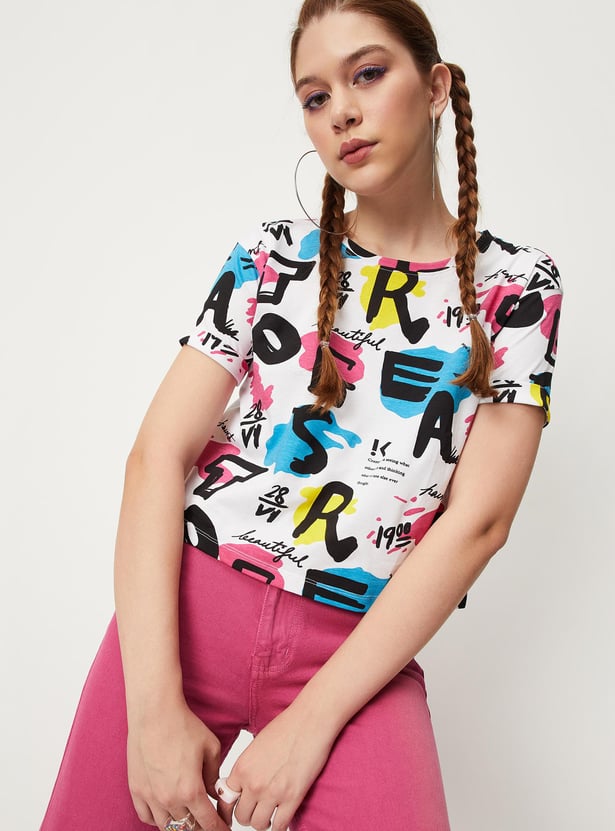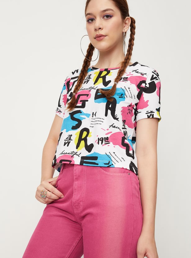 Bring a fashionable twist to your casual collection with this crop t-shirt. It is designed with an all-over printed surface, a round neck, and half sleeves. To make this crop t-shirt stand out team it up with a pair of jeans and boots.