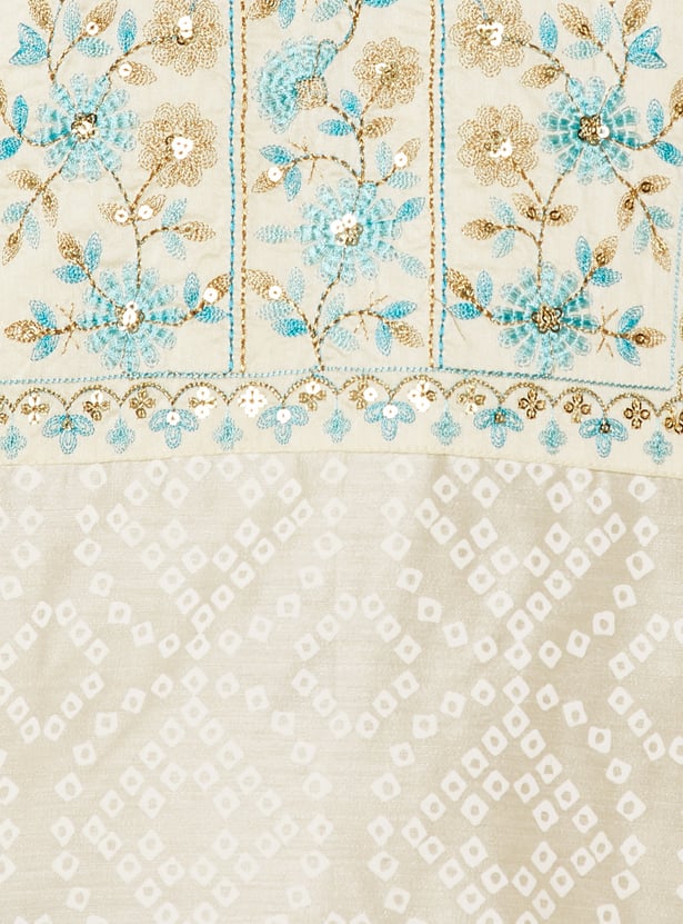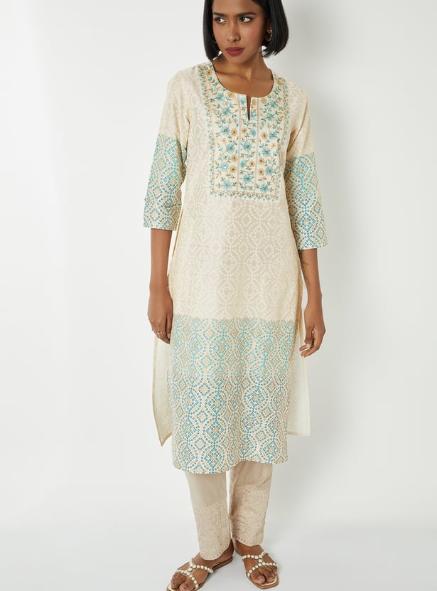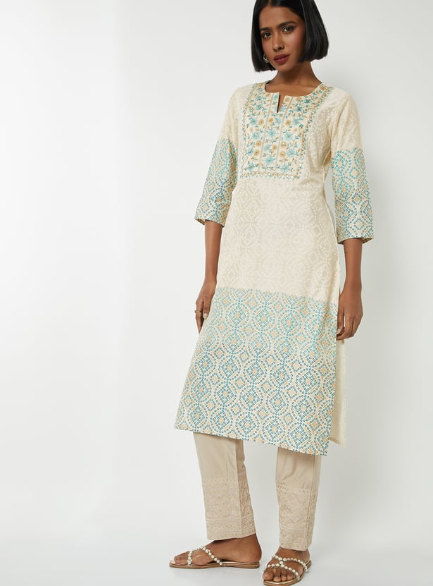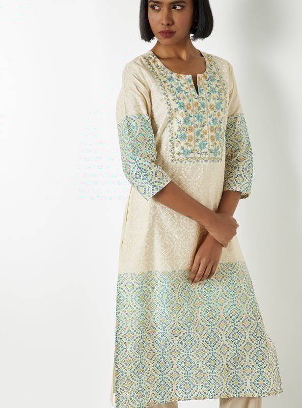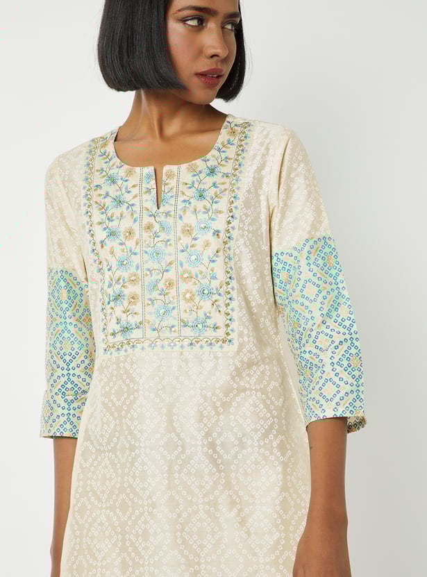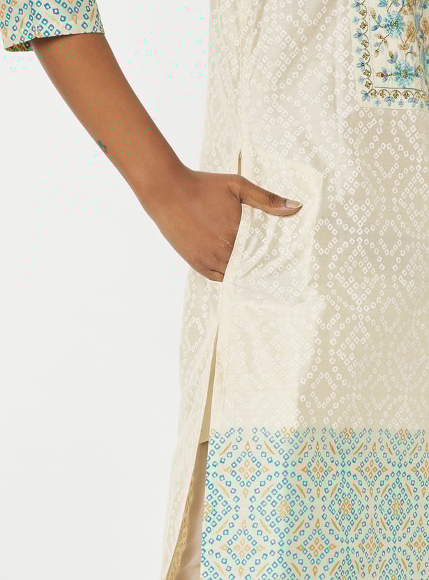 Elevate your look in tradition with this straight kurta features a vibrant Bandhani print and a delicately embroidered yoke that adds artisanal charm. The notched neckline and three-quarter sleeves offer a flattering silhouette, while side slits and a functional pocket bring comfort and practicality to the design.