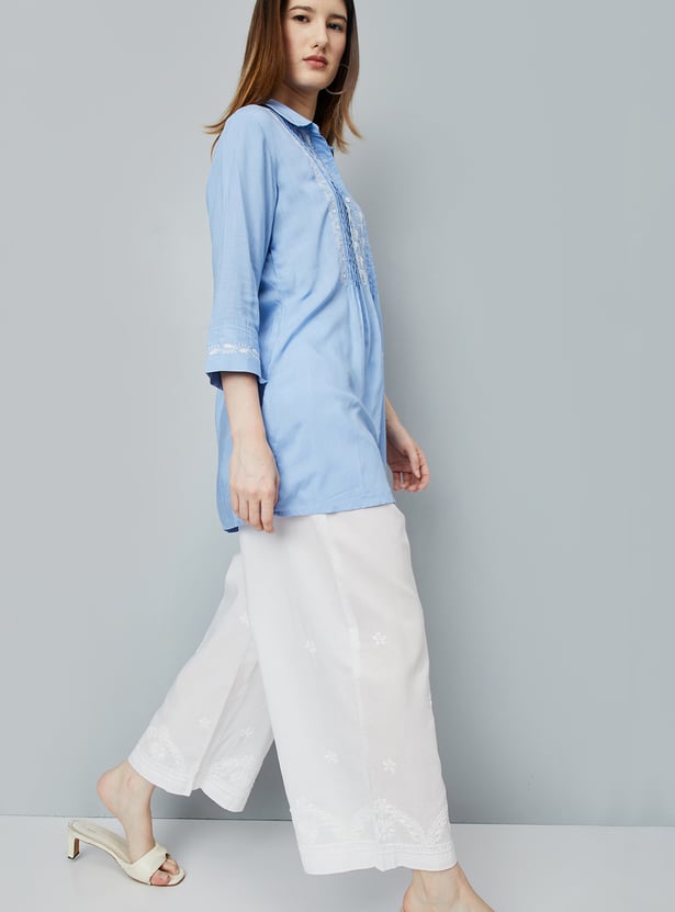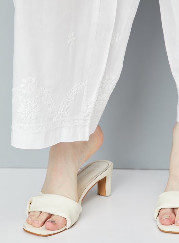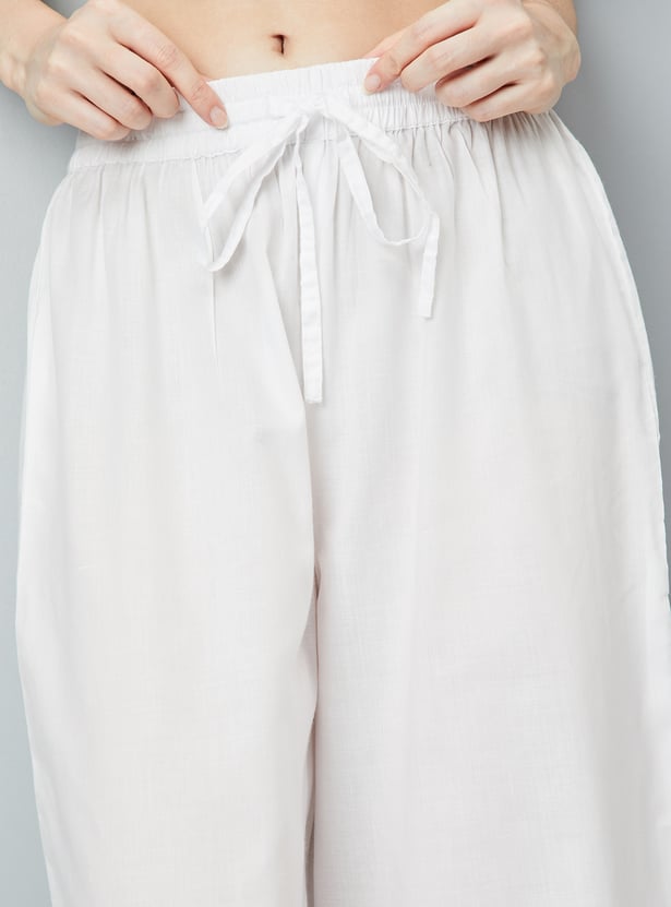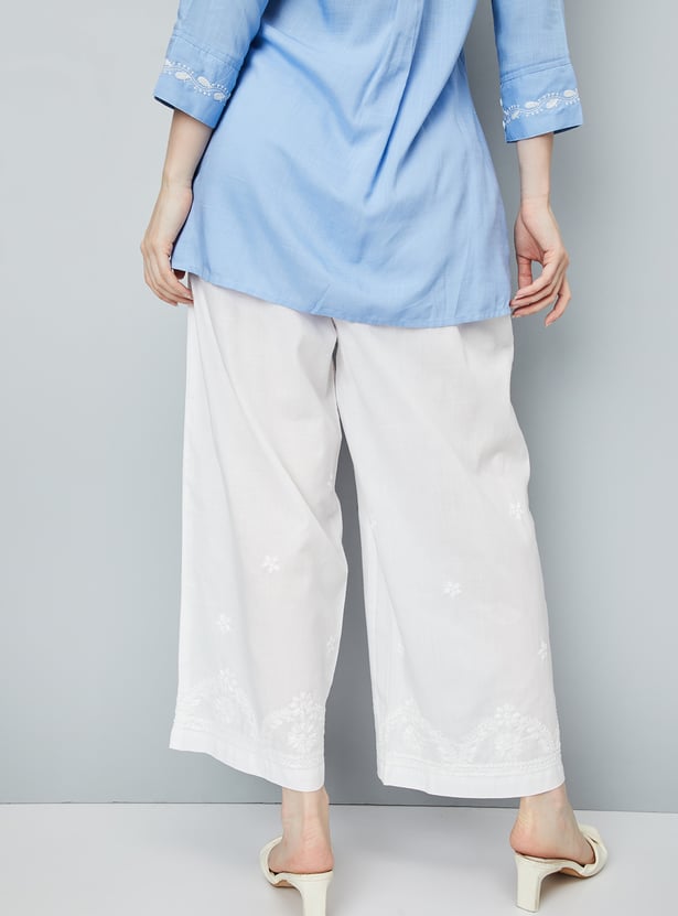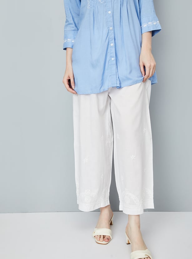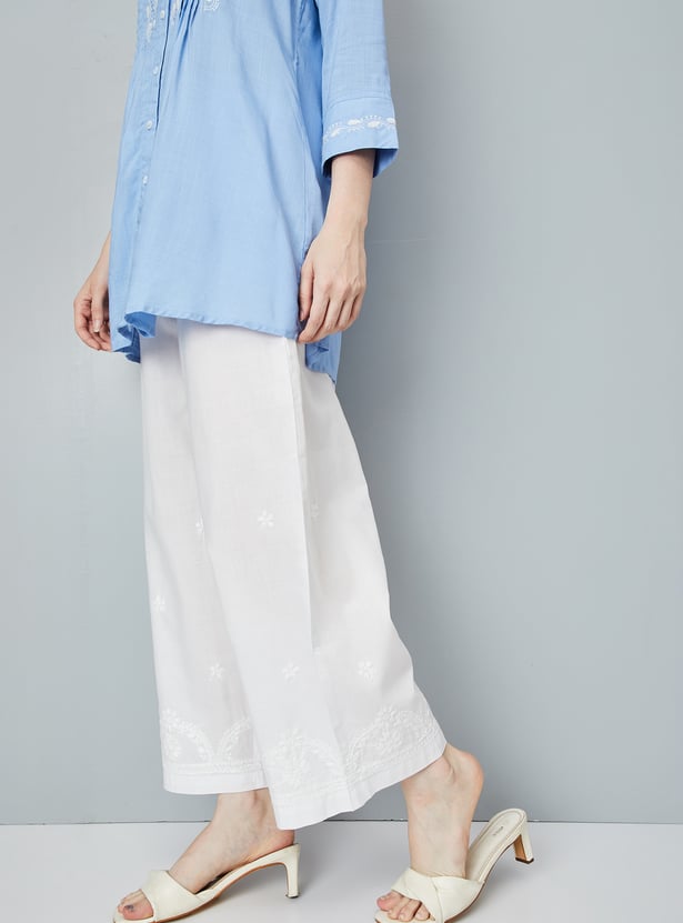 Breeze through the day in style with these palazzos. Featuring a drawstring waist, a wide-leg profile, and intricate chikankari embroidery, they add an elegant touch to your ensemble.