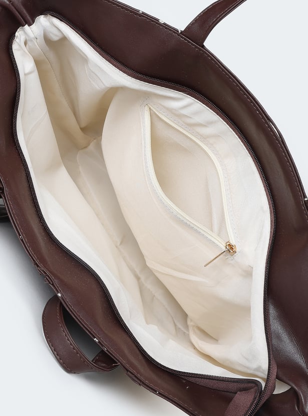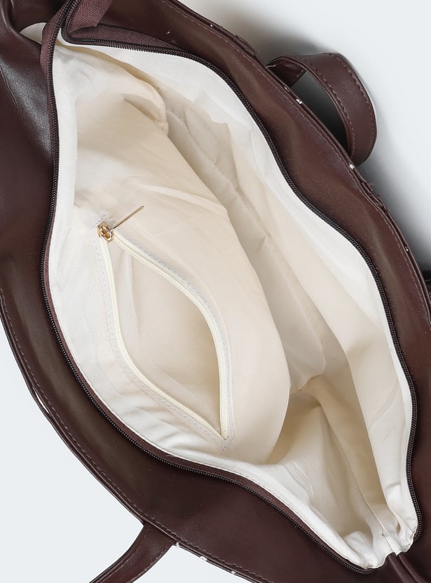 Add a stylish touch to your everyday look with this colourblock tote bag featuring twin handles and zip pockets for convenience.