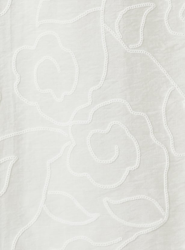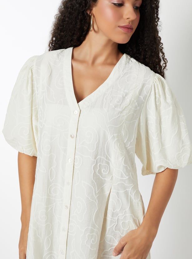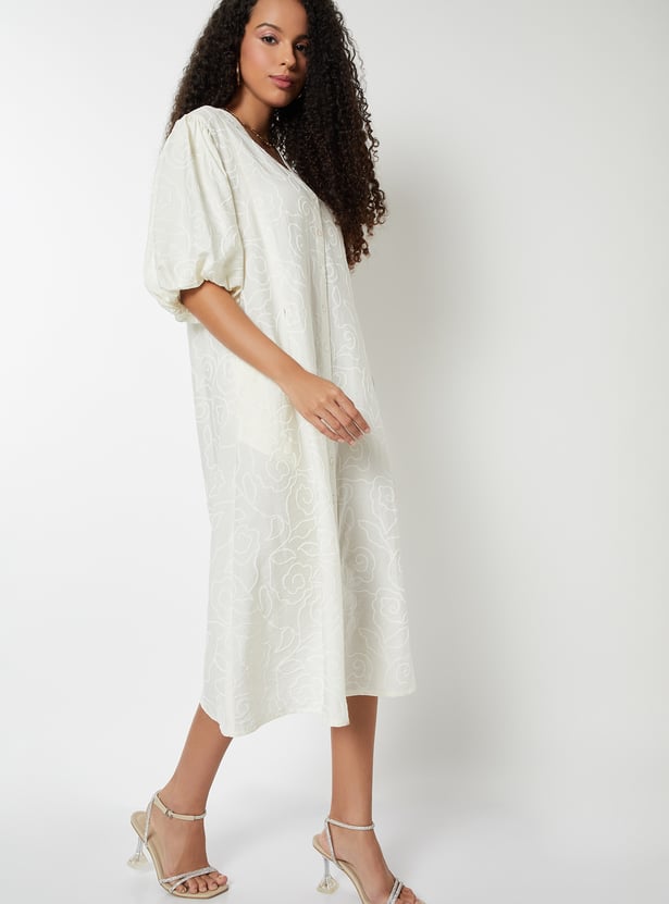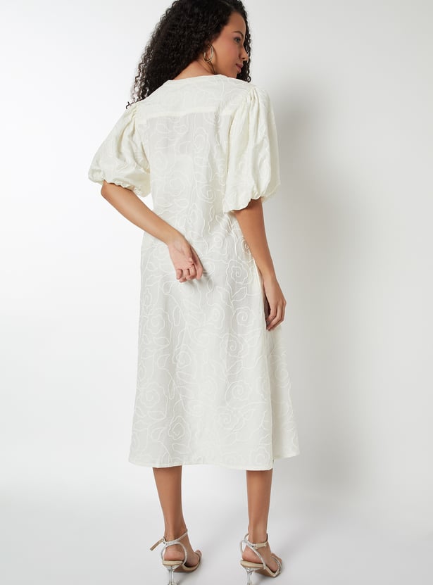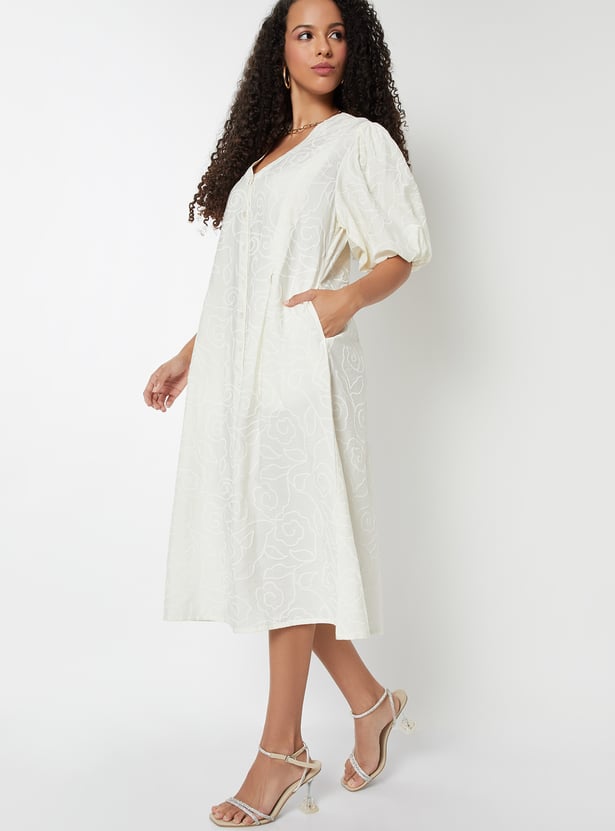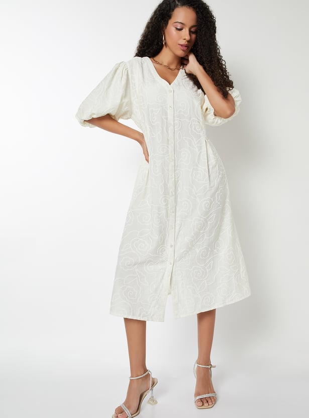 Embrace timeless charm with this embroidered A-line dress, crafted in a flattering midi length. It features a v-neck, button closure, and half puff sleeves for a soft, feminine silhouette.