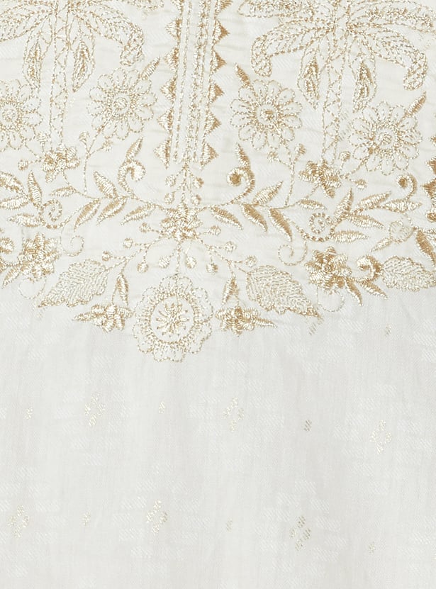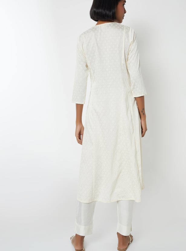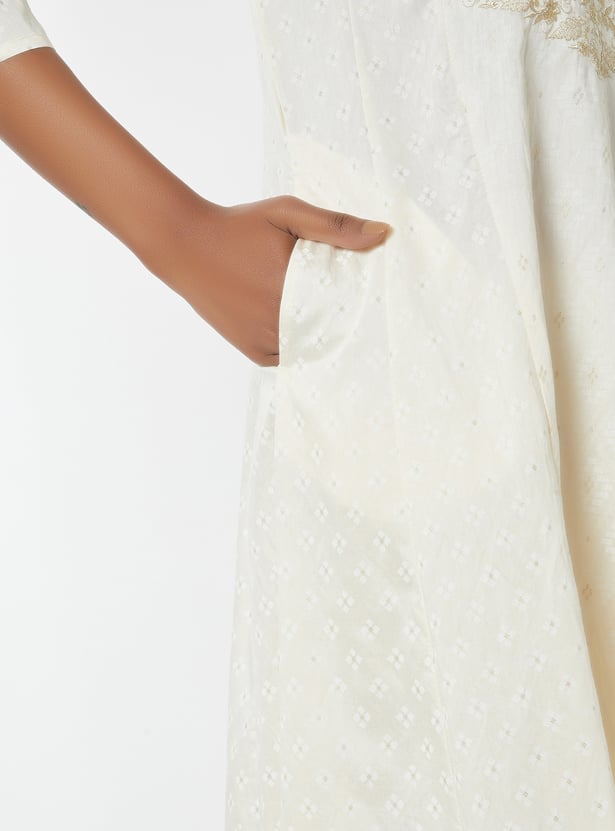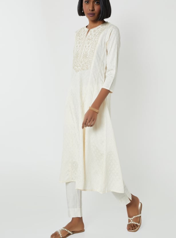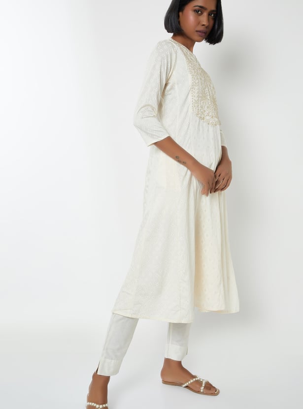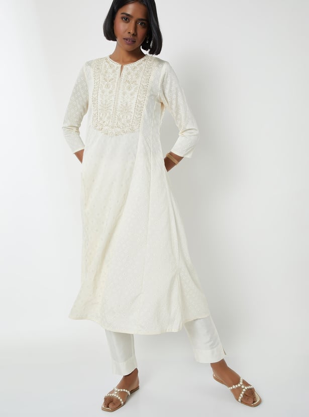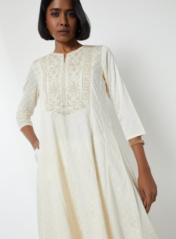 Step into effortless elegance with this kalidar kurta, designed with a flattering notch neck with embroidered yoke and 3/4th sleeves. A practical side pocket adds functionality to its graceful silhouette.
