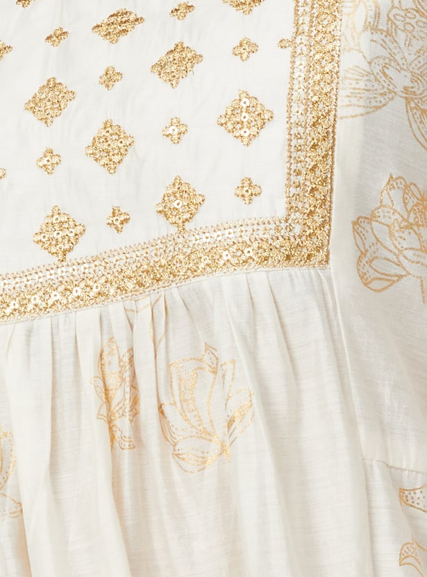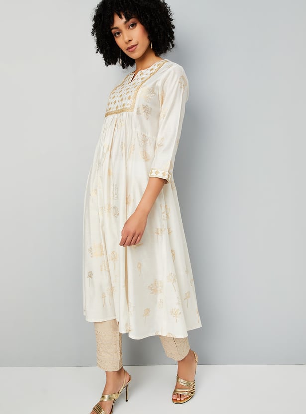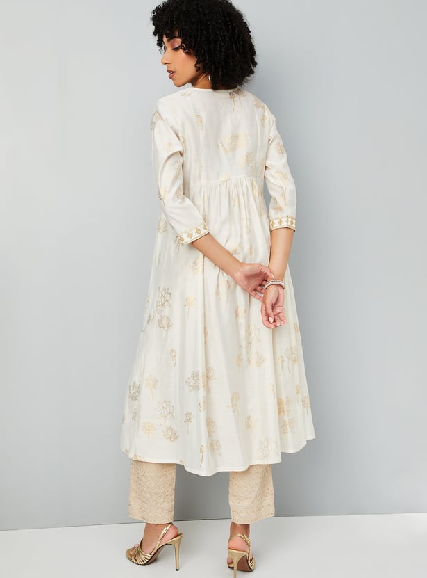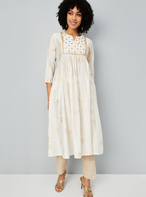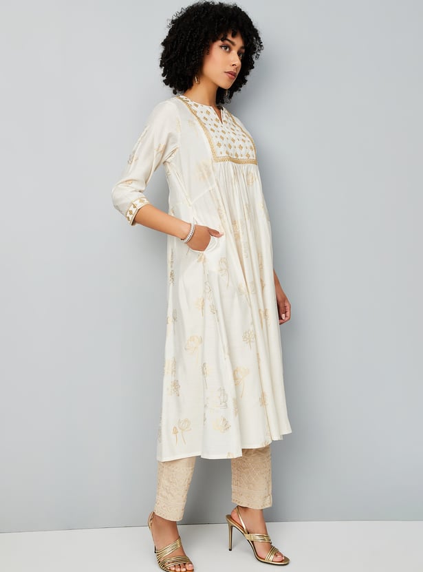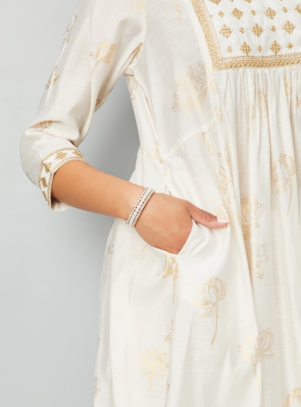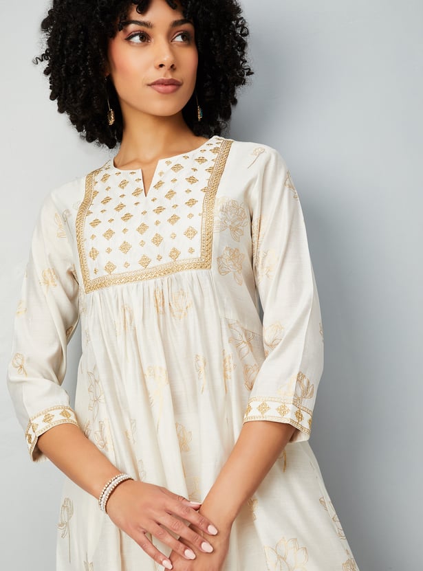 This embroidered A-line kurta brings together elegance and ease with its flowing silhouette and intricate detailing. Featuring a notch neck and 3/4th sleeves, it offers a refined look perfect for both everyday wear and special occasions.