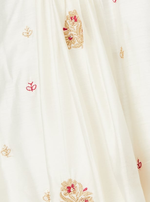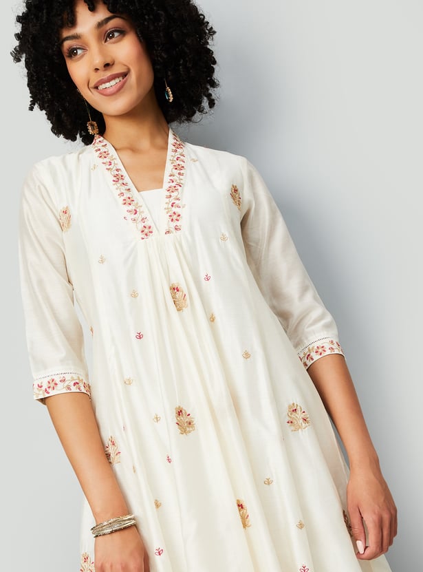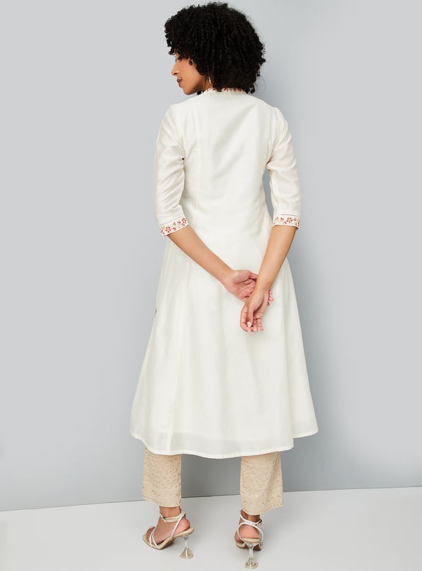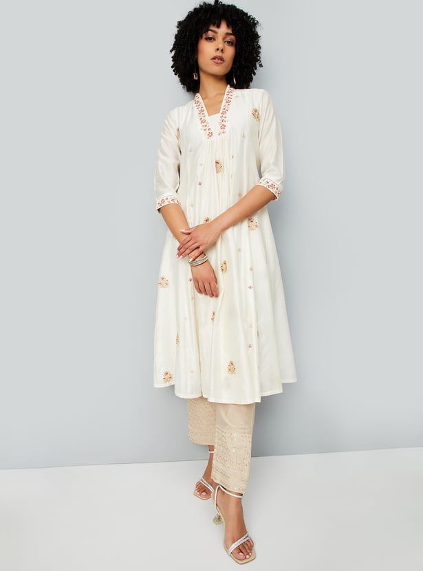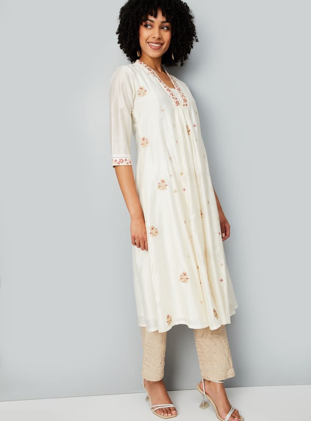 This embroidered A-line kurta brings together elegance and ease with its flowing silhouette and intricate detailing. Featuring a notch neck and 3/4th sleeves, it offers a refined look perfect for both everyday wear and special occasions.