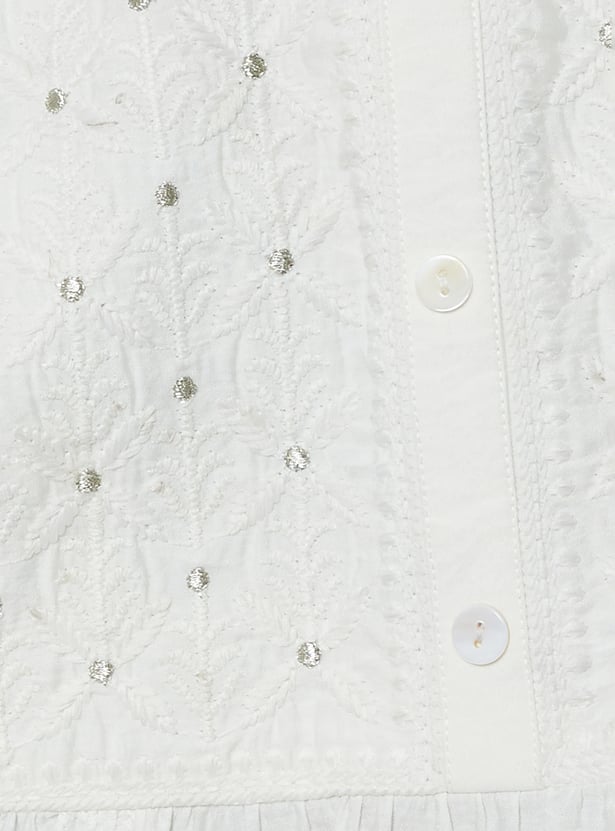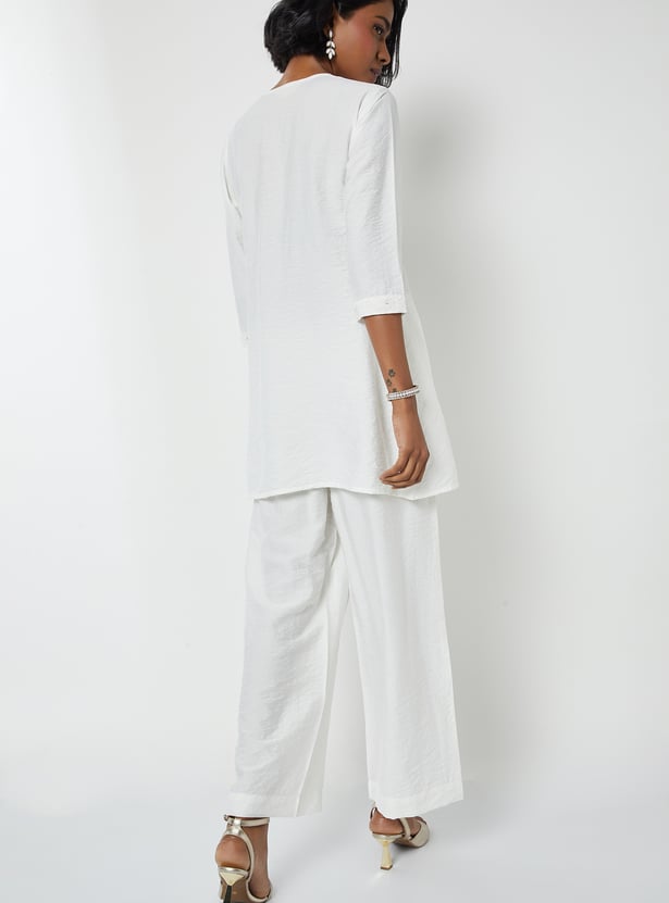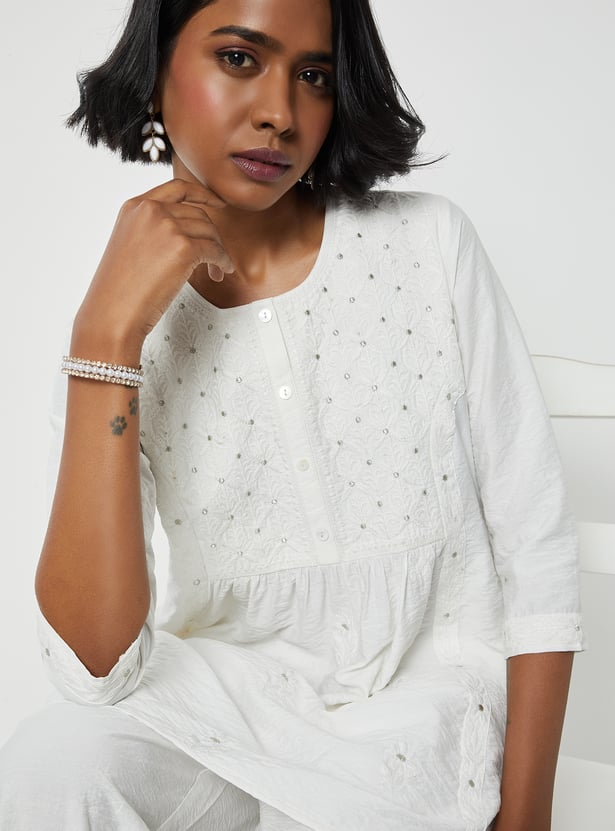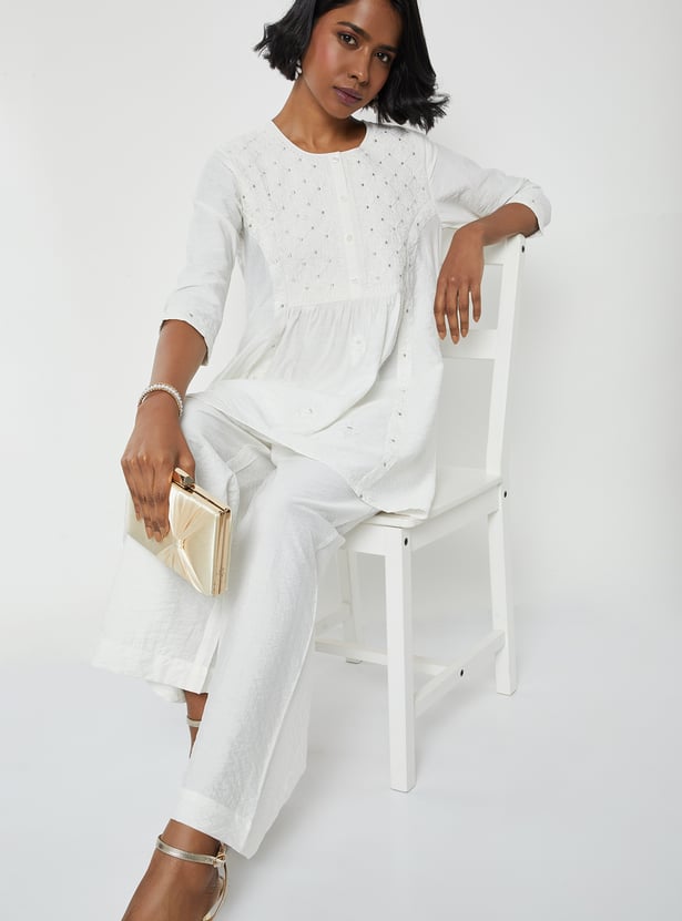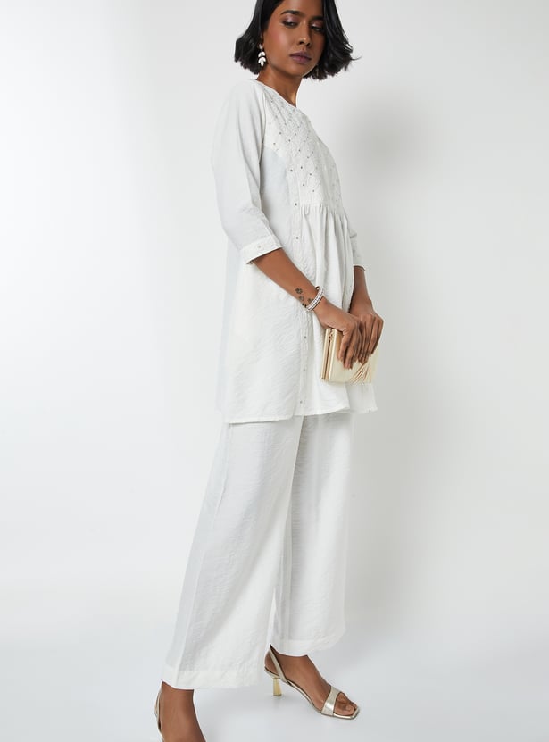 Grace your wardrobe with this elegant embroidered A-line kurta set. The kurta features a round neck and 3/4th sleeves, offering a flattering and flowy silhouette. It is paired with solid palazzos featuring an elasticated waistband for all-day comfort and ease.