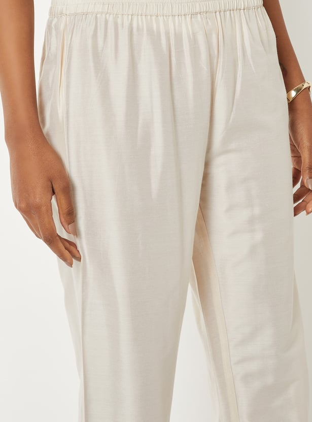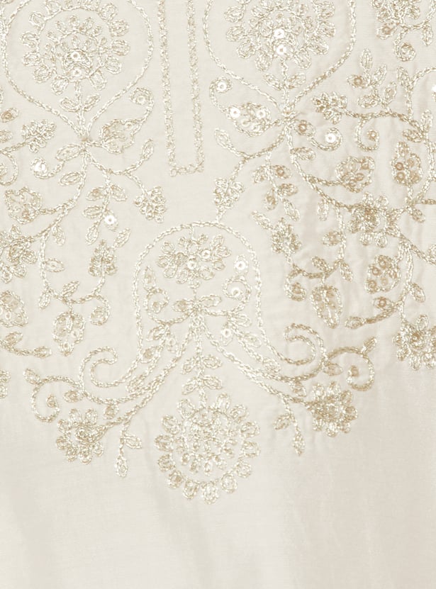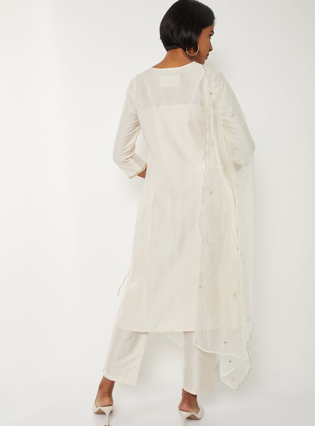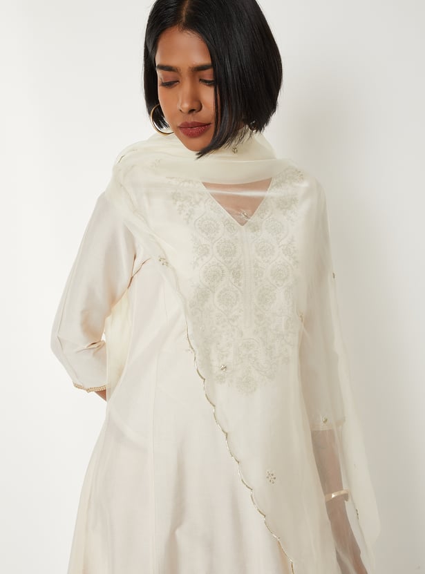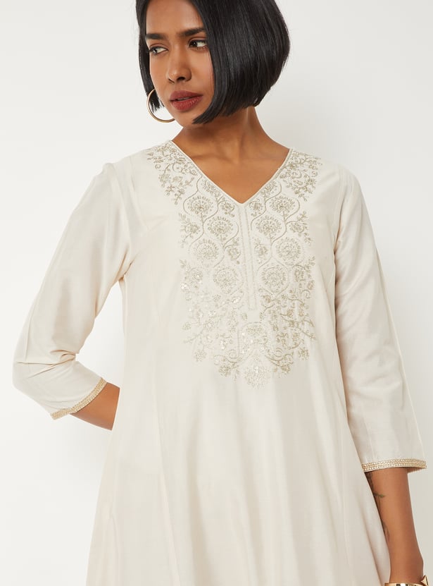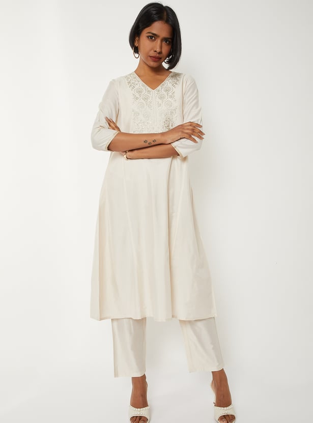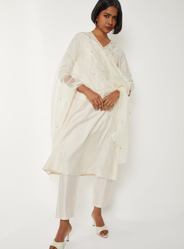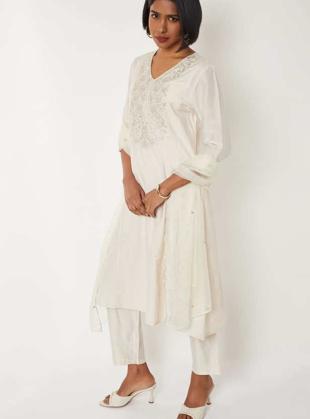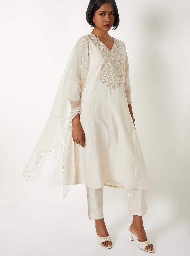 Grace your ethnic collection with this embroidered A-line kurta set, styled with a flattering V-neck and 3/4th sleeves. Paired with straight pants featuring an elasticated waist and finished with a dupatta, it offers a perfect blend of elegance and comfort.