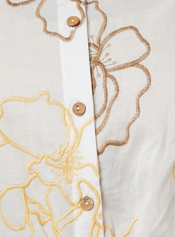 Step out in style with this embroidered A-line shirt dress featuring a spread collar, button placket, and 3/4th sleeves. Designed with a convenient side pocket, it perfectly balances comfort and sophistication.