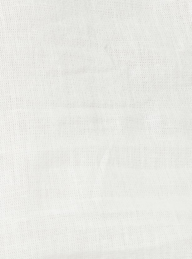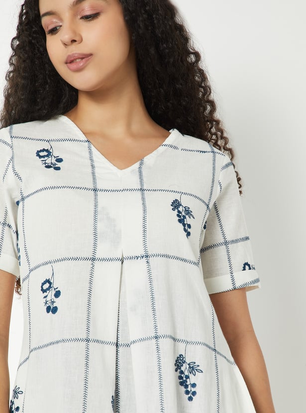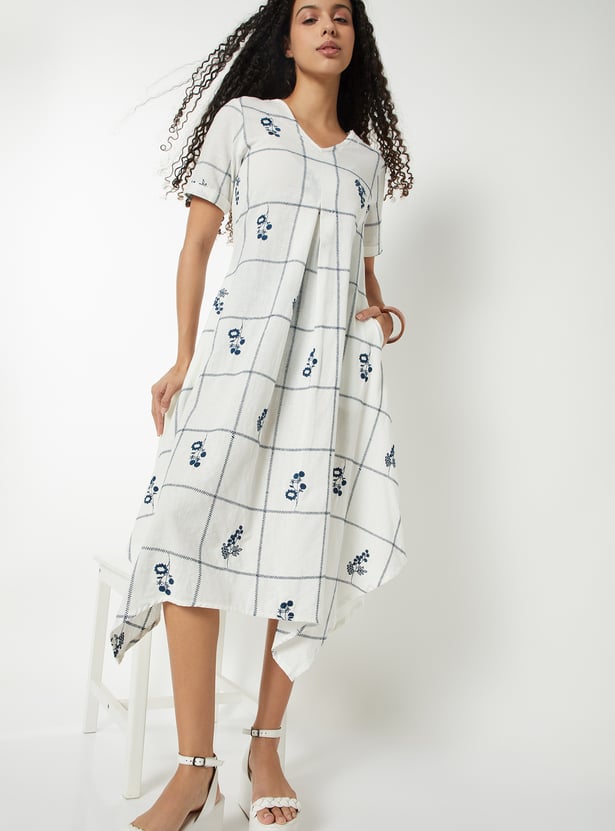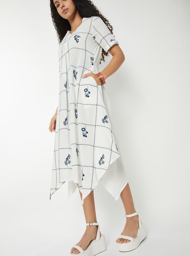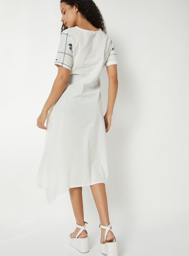 This all-over embroidered A-line dress features a graceful asymmetrical hem, V-neck, and half sleeves. Its intricate detailing and fluid silhouette create a perfect balance of elegance and ease.