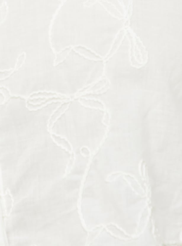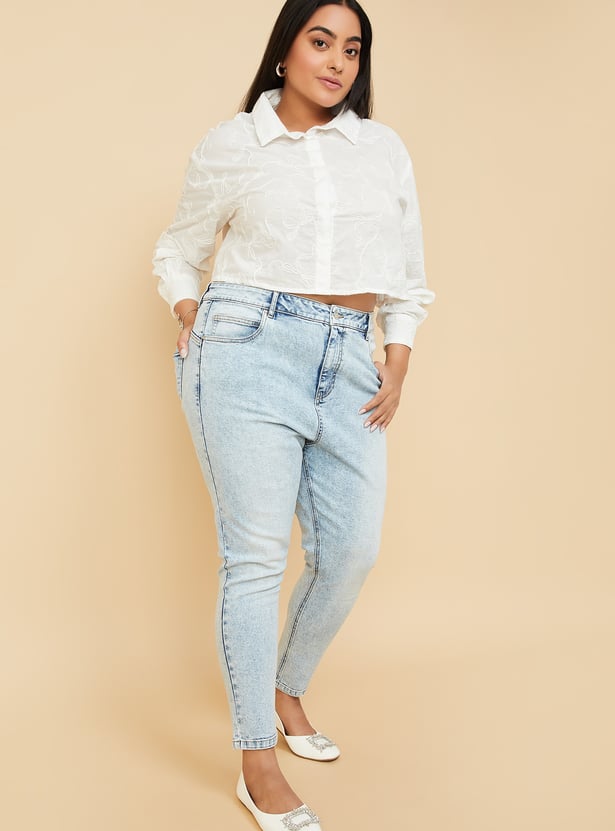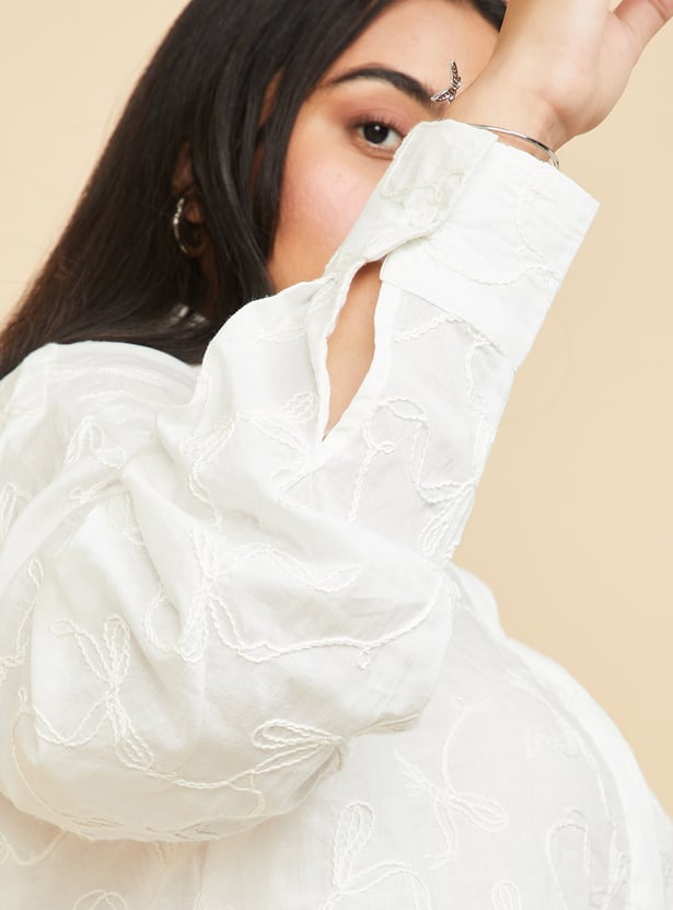 This embroidered crop shirt adds a stylish twist to your wardrobe with its intricate embroidery and trendy design. Featuring a spread collar for a sharp look, a button placket for a classic touch, and full sleeves with button cuffs for a tailored finish, it brings a chic, fashionable vibe.Model Size :