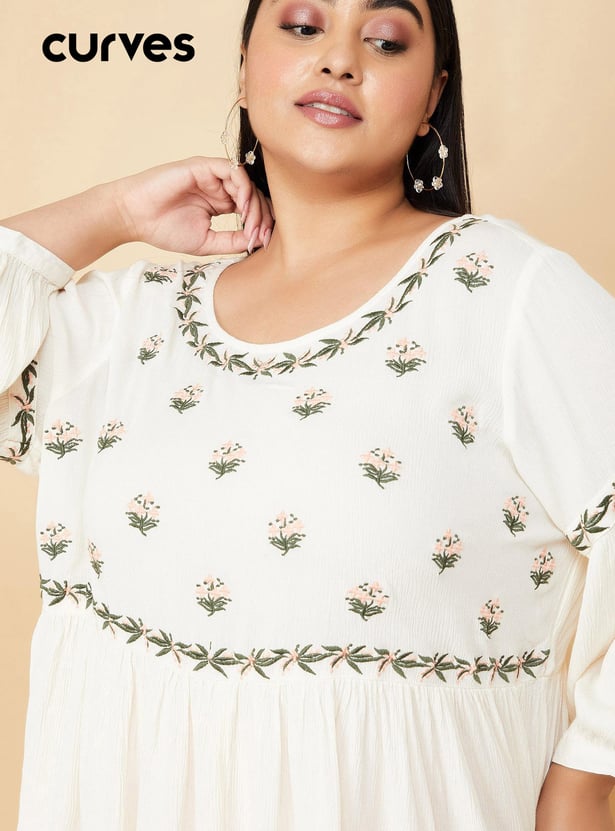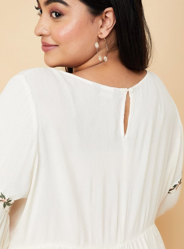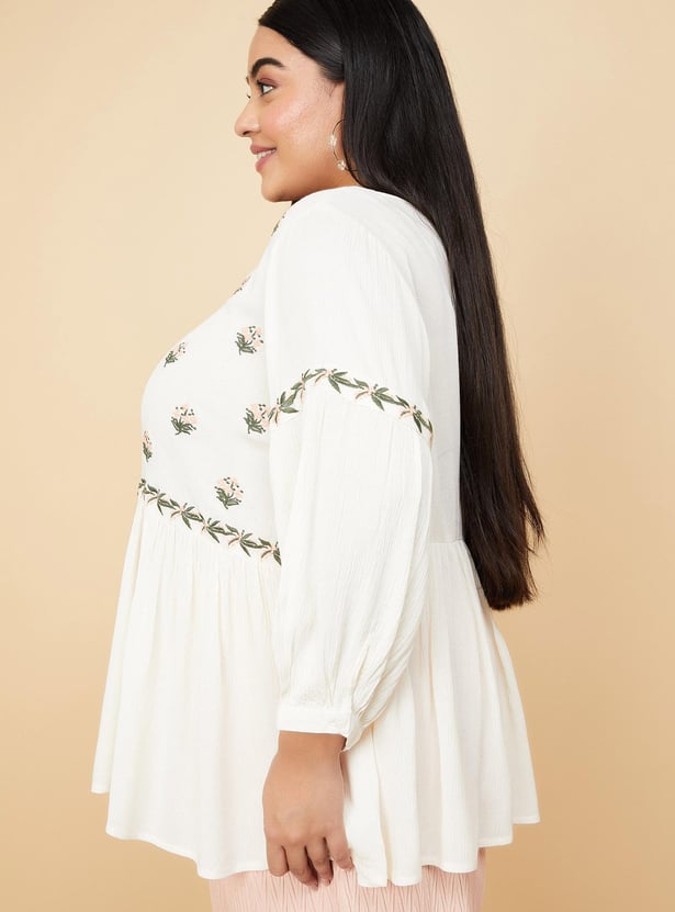 Breeze through the day in style in this top. It is highlighted with floral embroidery at the yoke and sleeves. This top has a round neck, full sleeves, and a gathered waist. Model Size :