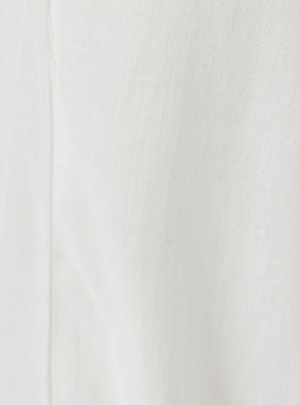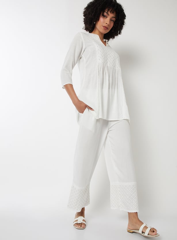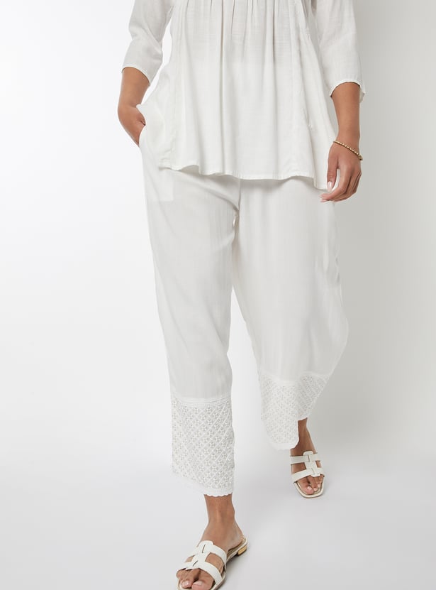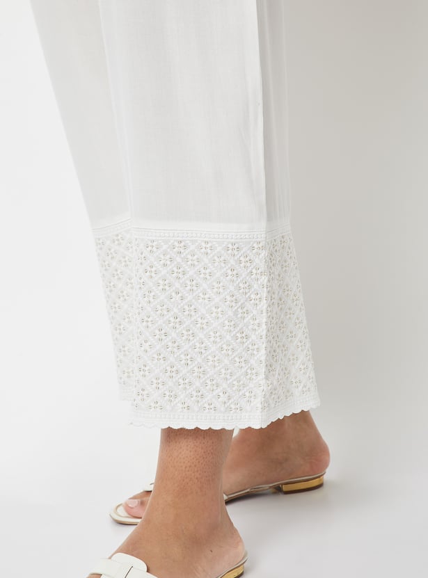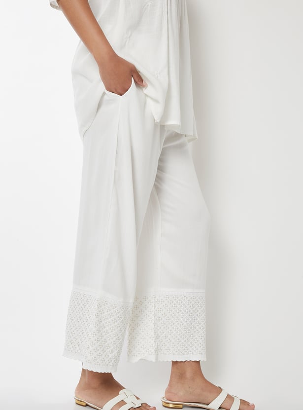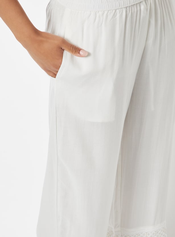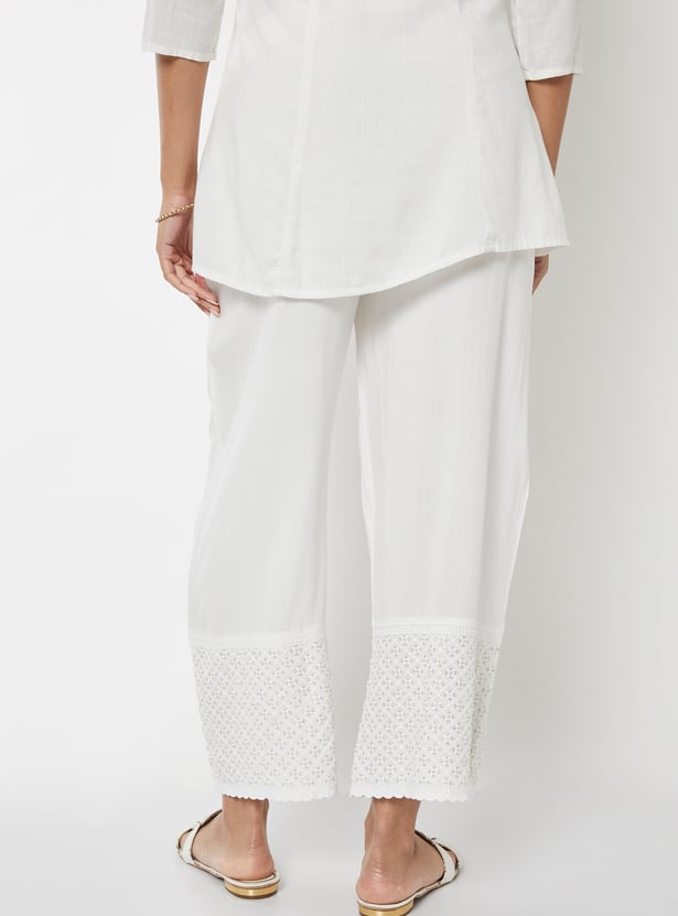 These embroidered hem palazzos add a stylish flair to your ethnic wardrobe. Designed with an elasticated waist and functional pockets, they offer both comfort and charm.