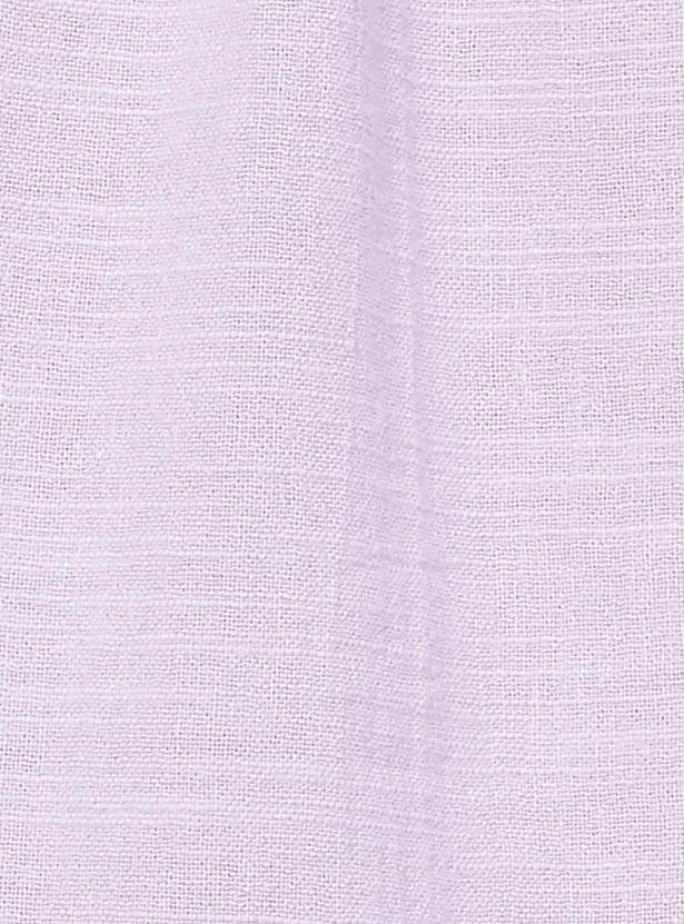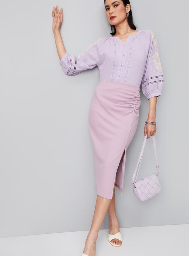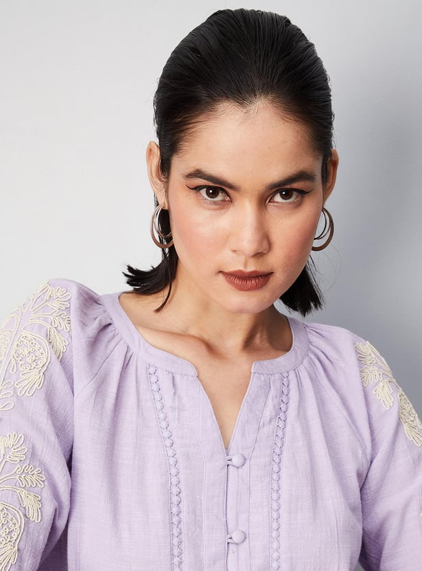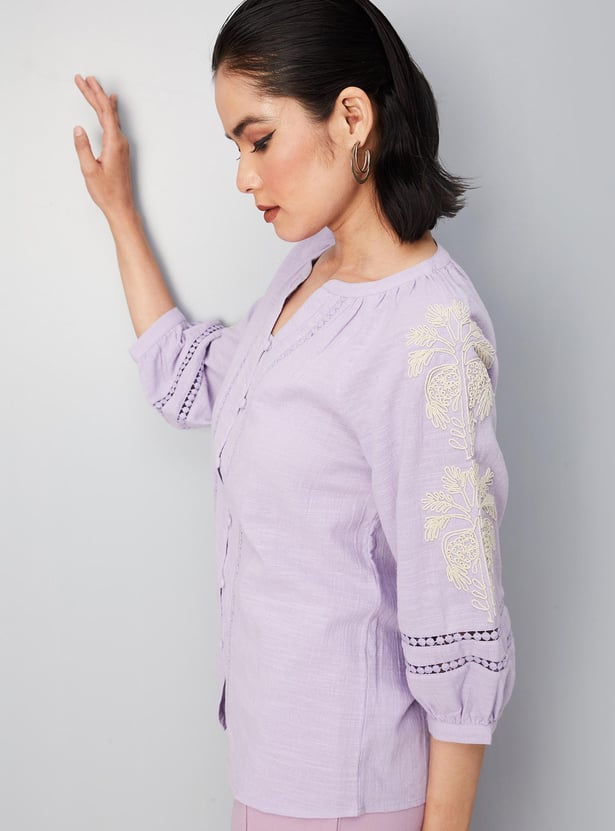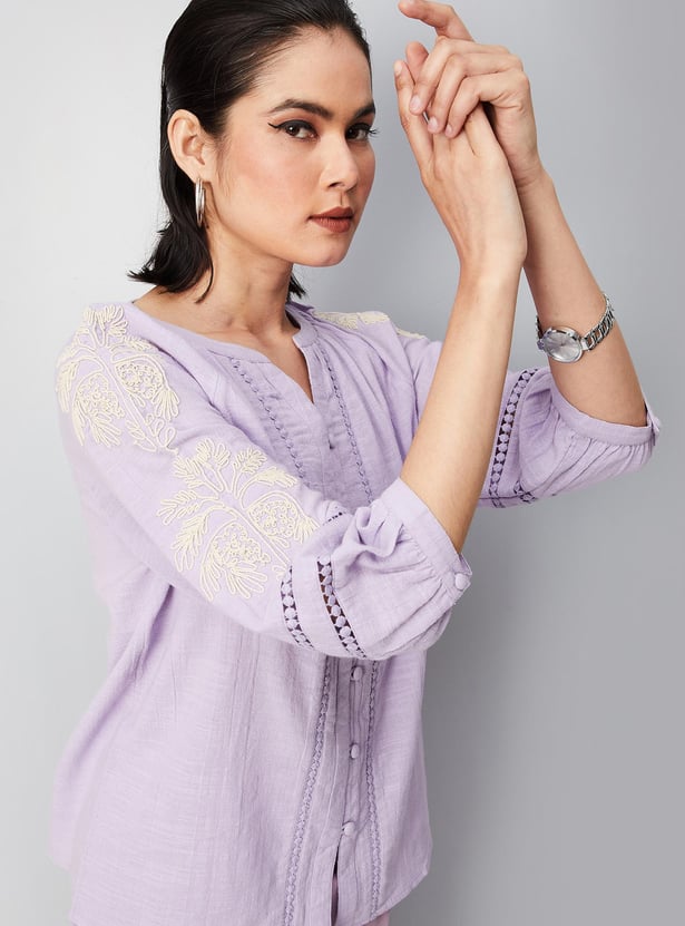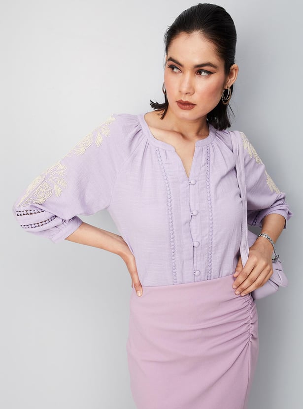 Exude an aura of elegance in this blouse with lace detailing. It is styled with a split V-neck, button front, three-quarter sleeves with embroidery, and a curved hem. Team up this blouse with trousers and pumps to ace the look.