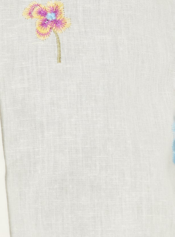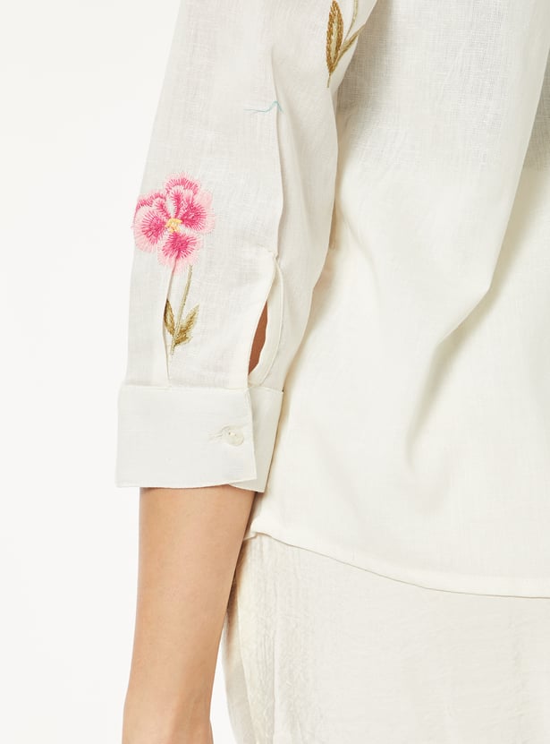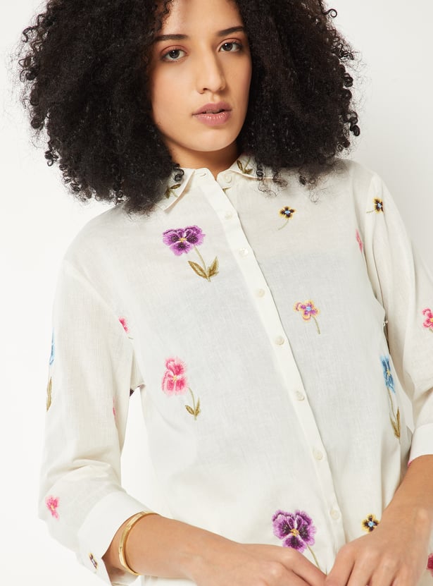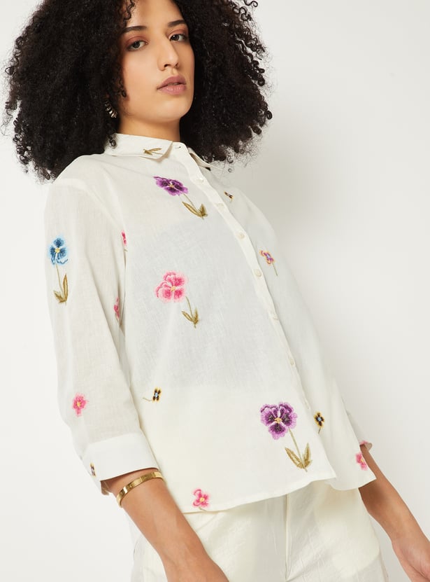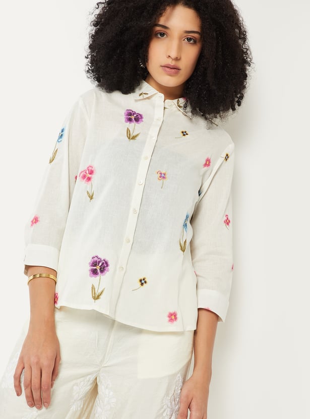 Add effortless charm to your wardrobe with this embroidered shirt. Featuring a smart spread collar, 3/4th sleeves, and a button placket, it combines classic tailoring with a relaxed silhouette for versatile styling.