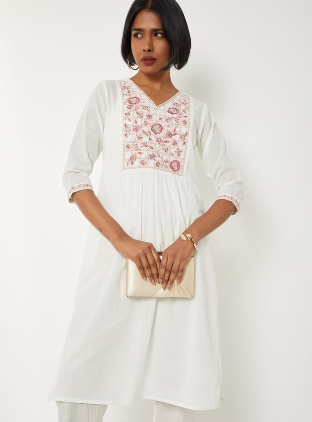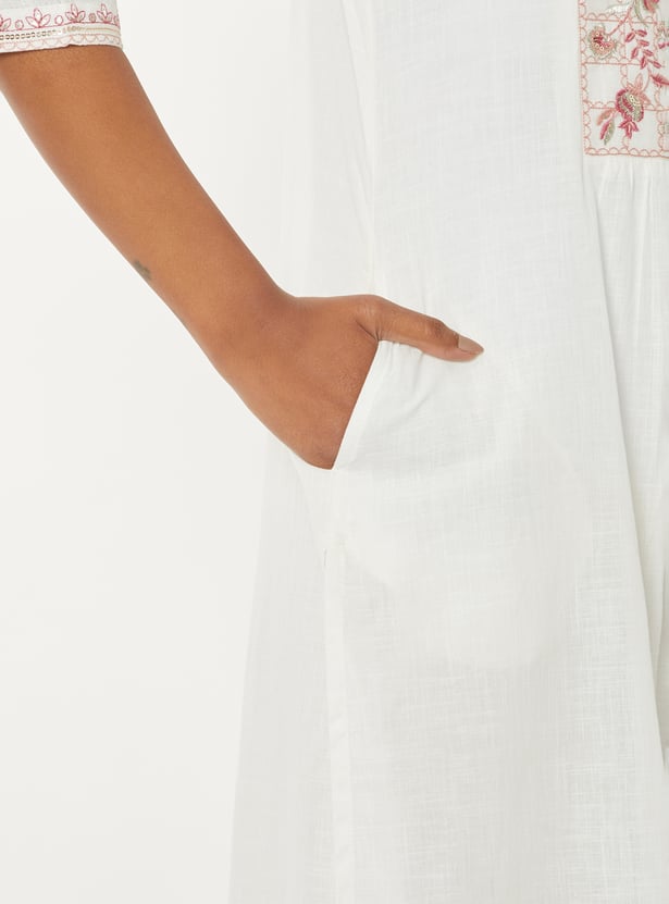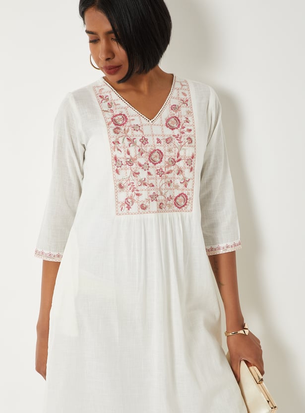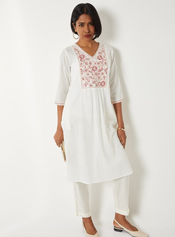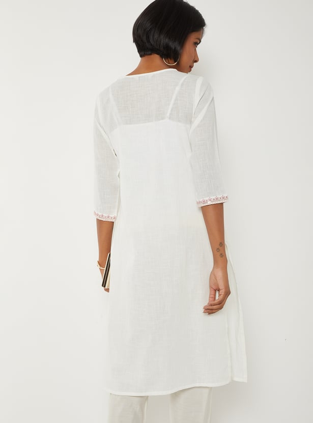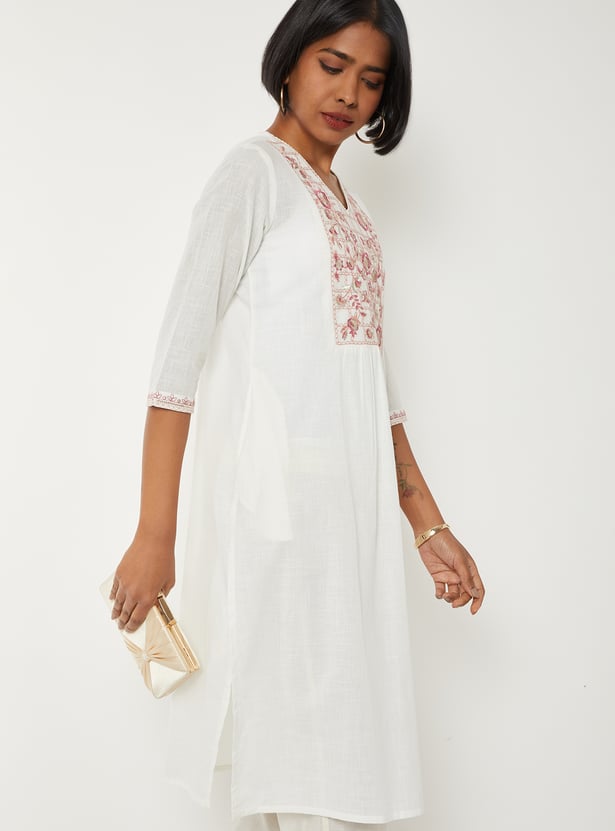 Bring refined elegance to your wardrobe with this embroidered straight kurta. Featuring a flattering V-neck, 3/4th sleeves, and side slits, it offers a sleek silhouette with added comfort. The delicate embroidery enhances its charm, while the side pocket adds a practical touch without compromising style.