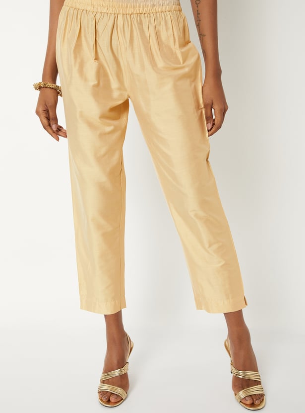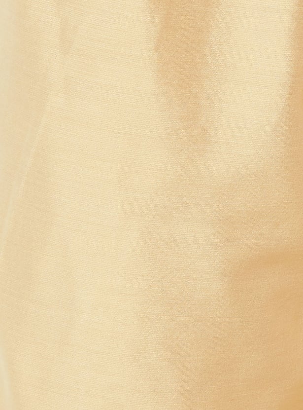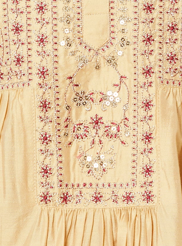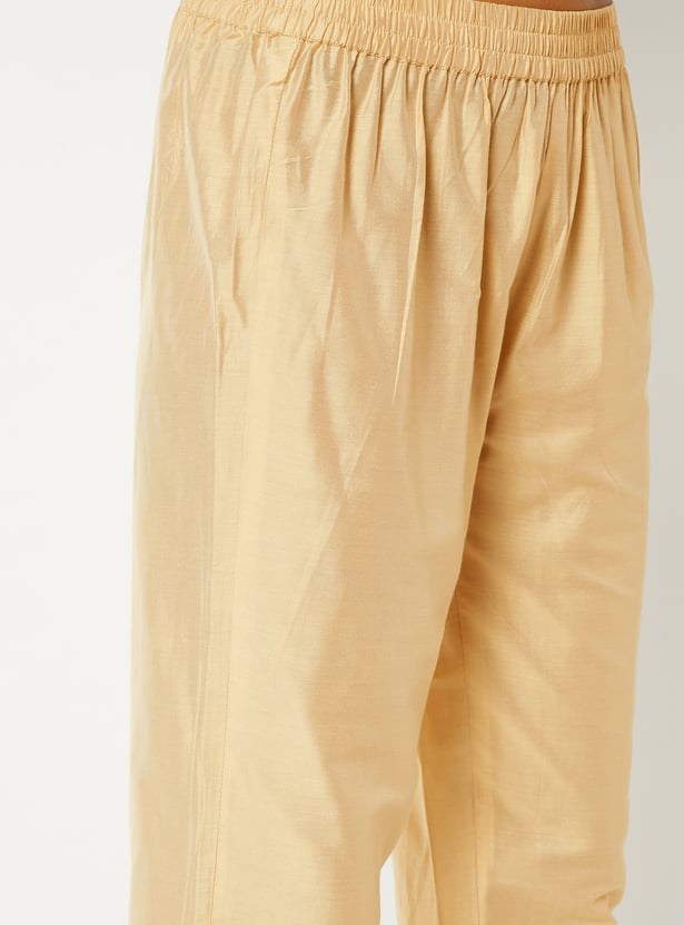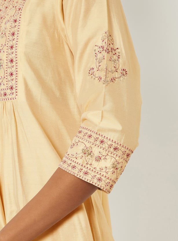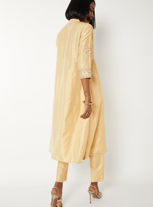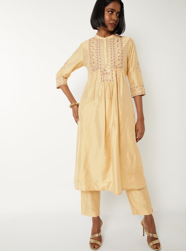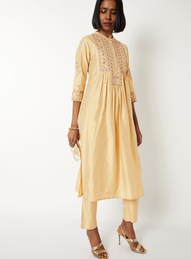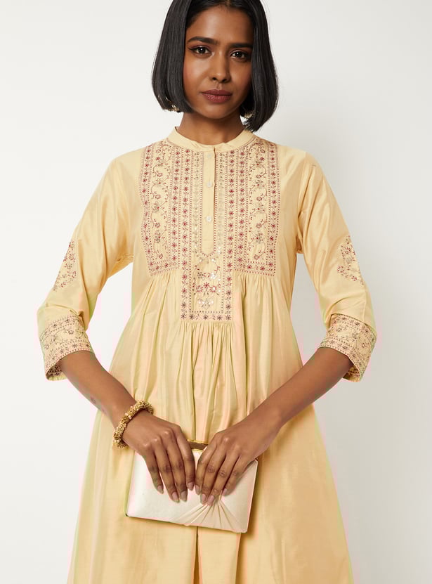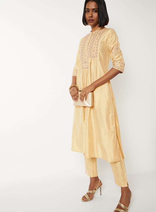 This embroidered A-line kurta set blends timeless elegance with everyday comfort. The kurta features a band collar, button placket, side pocket, and 3/4th sleeves, offering a graceful silhouette. It's paired with straight pants featuring an elasticated waist for a relaxed yet refined fit.