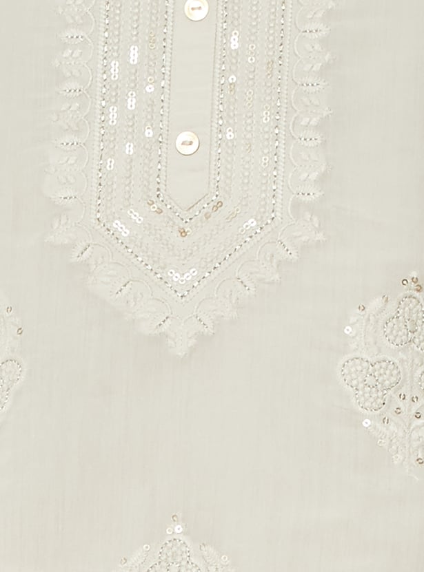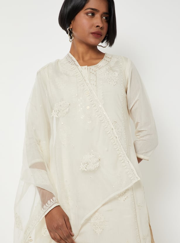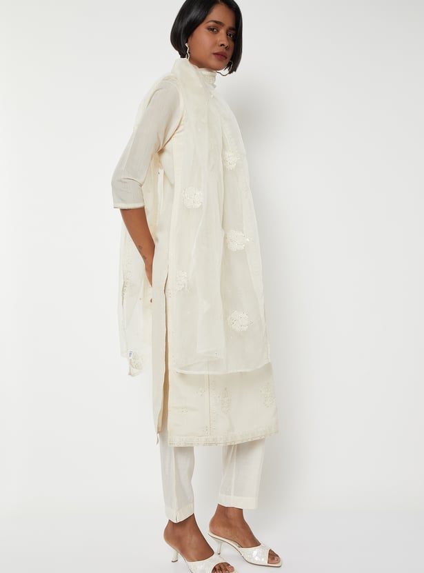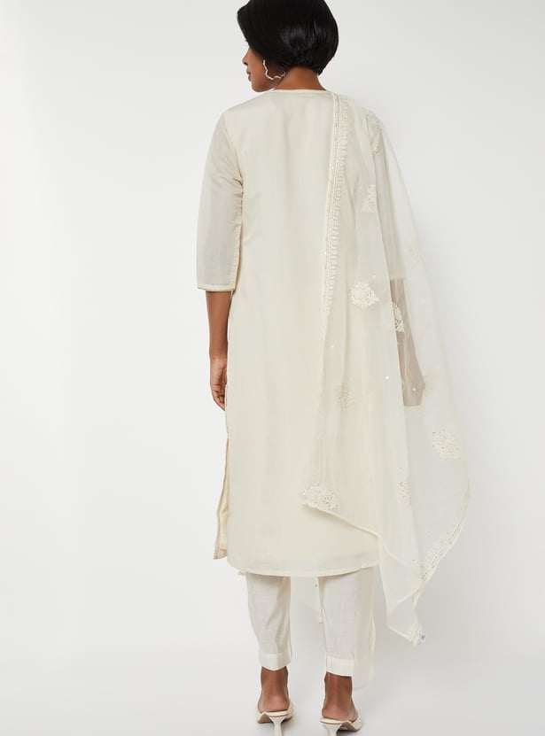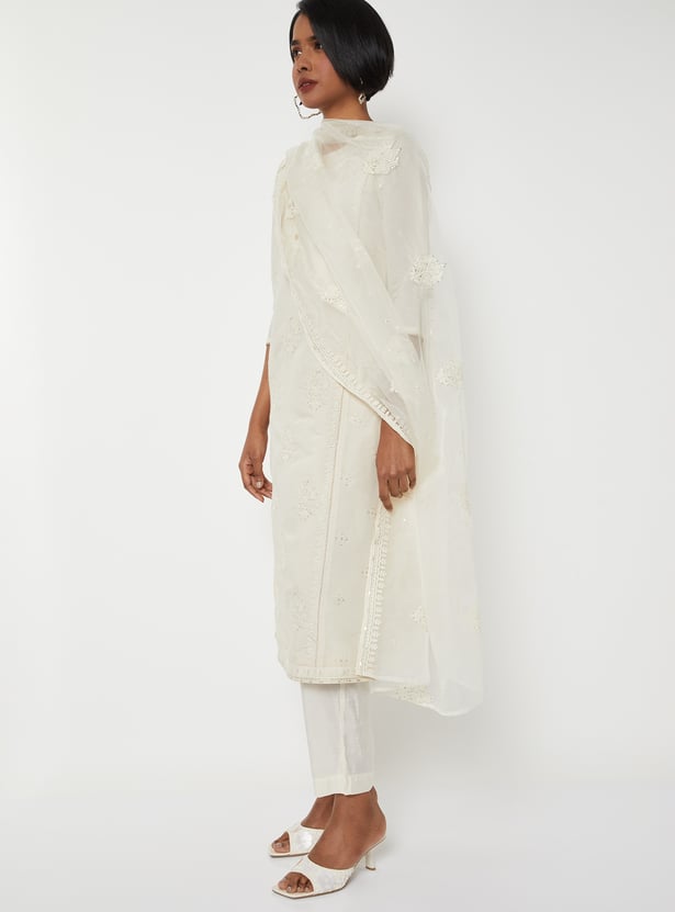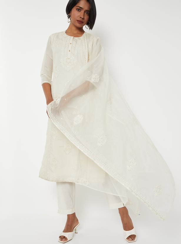 Elevate your ethnic wardrobe with this elegant embroidered straight kurta set. Featuring a round neck, button placket, 3/4th sleeves, and side slits, the kurta blends traditional detailing with modern simplicity. It is paired with straight pants designed with an elasticated waist for comfort, and a matching dupatta that completes the graceful ensemble.