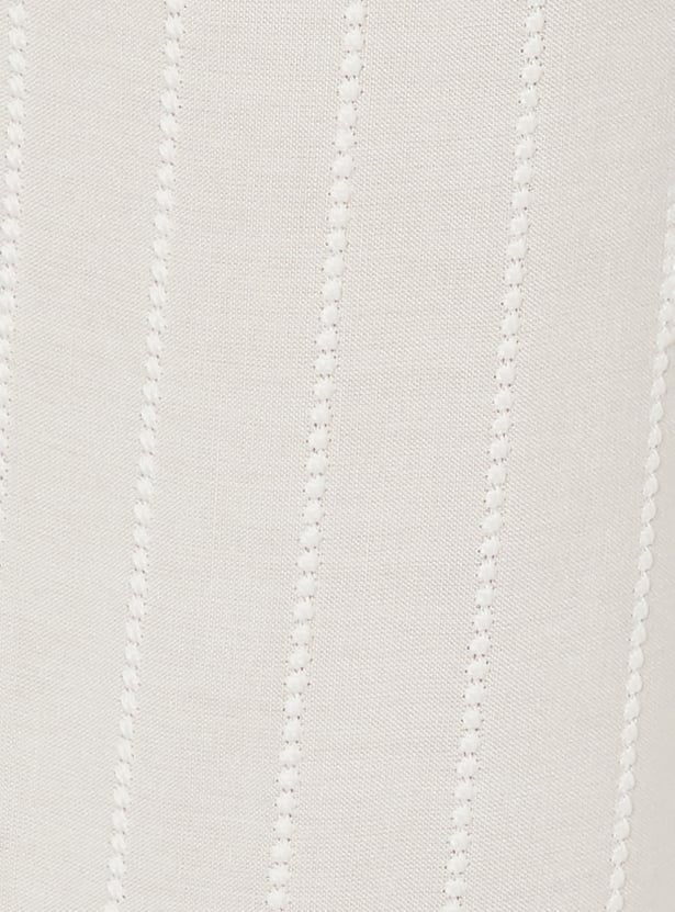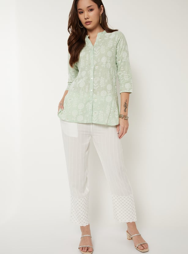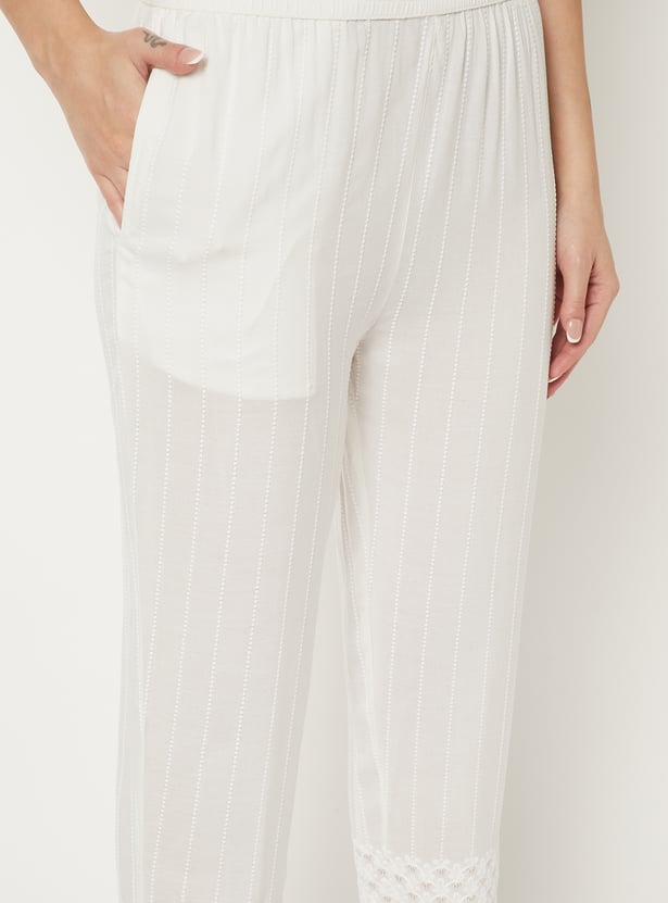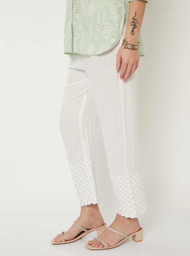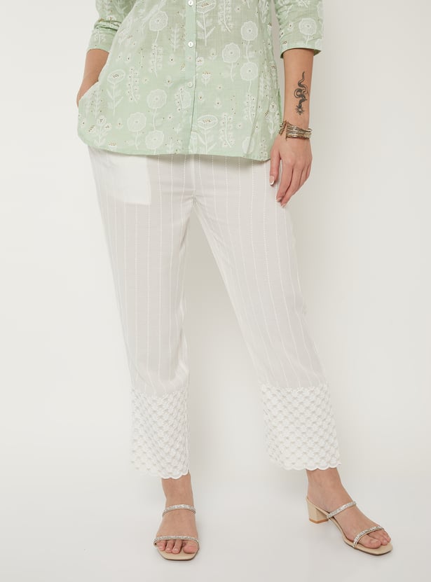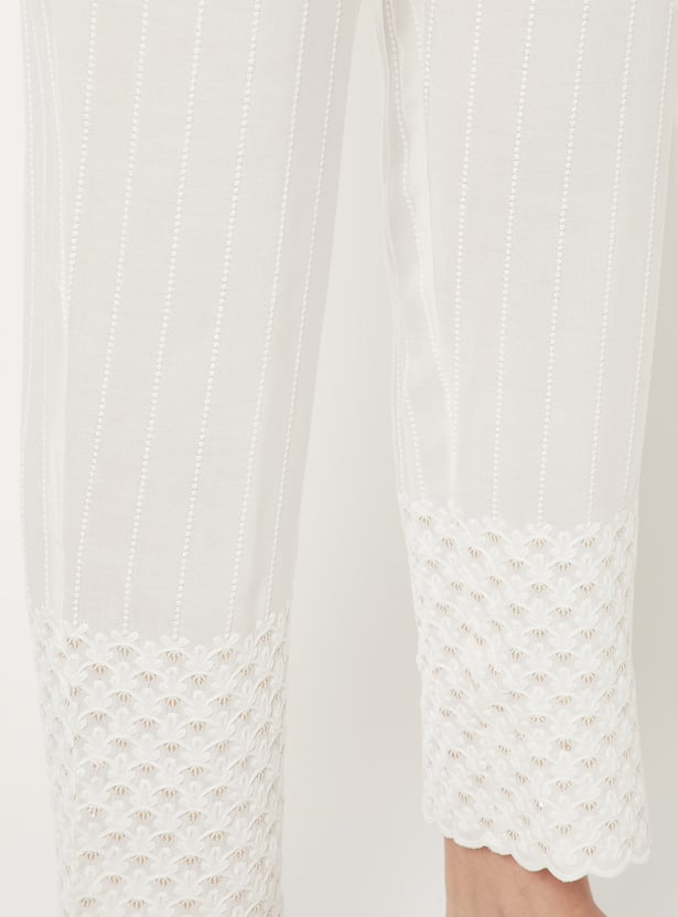 These straight-fit pants feature a beautifully embroidered panel that adds subtle detailing to the look. The scalloped hems give it a refined, feminine finish. The elasticated waist offers a comfortable fit for all-day wear, and the one side pocket adds easy functionality.